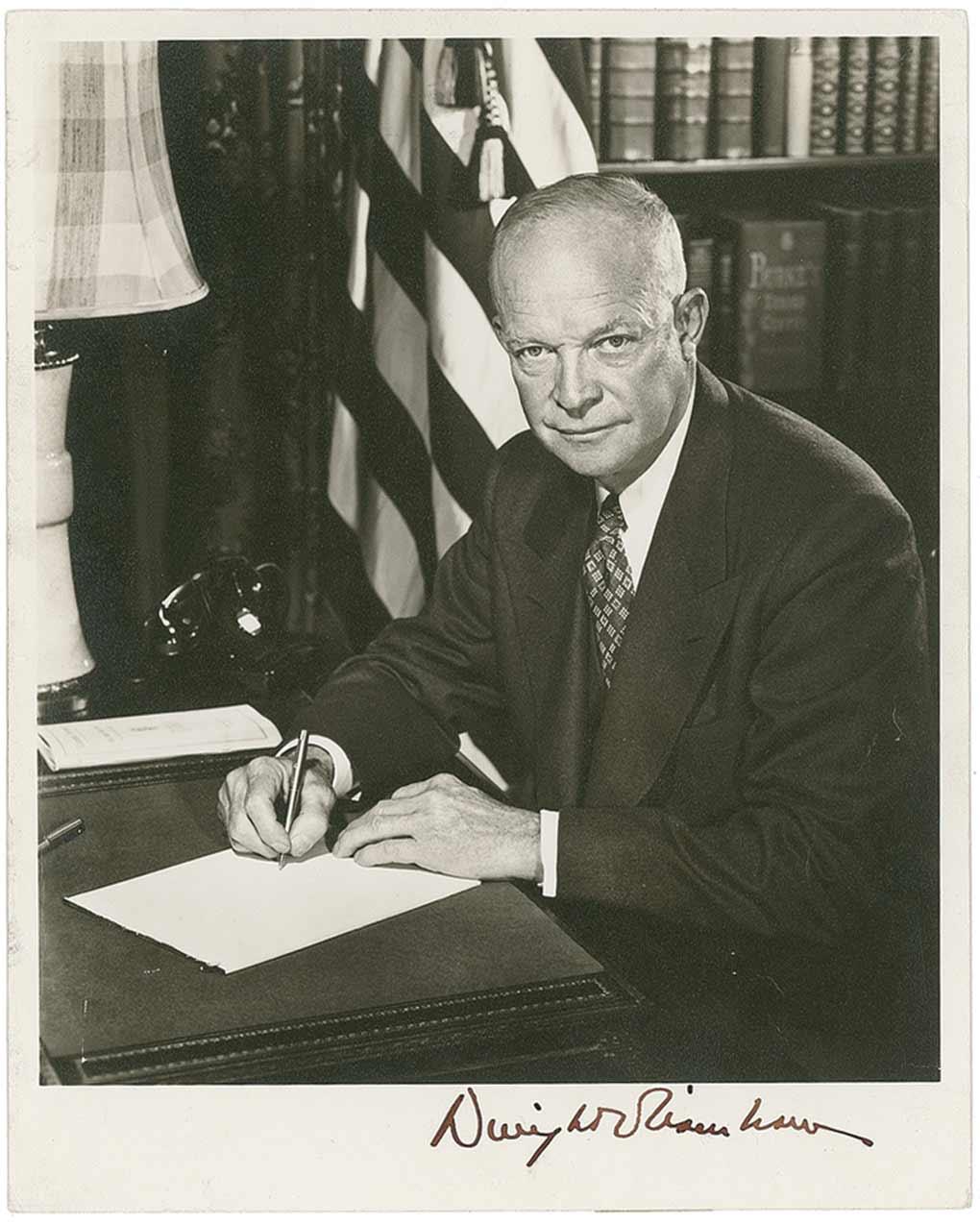 Vintage matte-finish 8 x 10 photo of Eisenhower at his desk, signed in fountain pen in the lower border. Vertical crease running along left edge, some scattered light silvering, and a few other surface creases, otherwise fine condition.