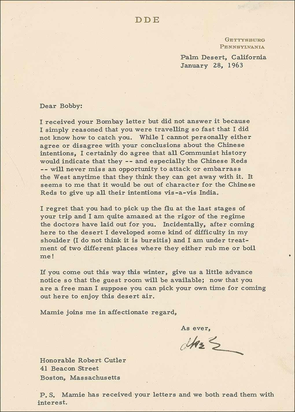 TLS, signed “Ike E.,” one page, 7 x 10.25, personal letterhead, January 28, 1963. Eisenhower writes from Palm Desert, California to Robert Cutler, his former National Security Advisor (the first individual to hold the post) in Boston. In part: “While I cannot personally either agree or disagree with your conclusions about the Chinese intentions, I certainly do agree that all Communist history would indicate that they—and especially the Chinese Reds—will never miss an opportunity to attack or embarrass the West anytime that they think they can get away with it. It seems to me that it would be out of character for the Chinese Reds to give up all their intentions vis-a-vis India…. Incidentally, after coming here to the desert I developed some kind of difficulty in my shoulder (I do not think it is bursitis) and I am under treatment of two different places where they either rub me or boil me!…” In 1962 the Chinese scored a decisive military victory in the Sino-Indian War, reclaiming the disputed area and declaring a unilateral cease-fire in November. A decade earlier, as president-elect, Eisenhower was able to stop the Chinese through a combination of hints at nuclear war, the death of Joseph Stalin, and his own military reputation. In fine condition, with mild soiling and handling wear, and a couple faint pencil notations.