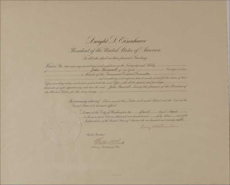 Partly-printed DS as president, one page, 23 x 19, August 15, 1953. President Eisenhower appoints John Roosevelt “a member of the Government Contract Committee.” Signed at the bottom by Eisenhower, and countersigned by the Acting Secretary of State. In fine condition, with scattered light creasing, wrinkling, and toning, as well as a couple small edge tears. The white wafer seal is crisp and intact. Pre-certified John Reznikoff/PSA/DNA and RRAuction COA.