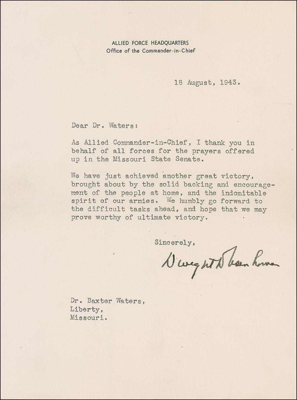 War-dated TLS, one page, 6 x 8, Allied Force Headquarters letterhead, August 18, 1943. Letter of thanks to Missouri State senator William Baxter Waters. In full: “As Allied Commander-in-Chief, I thank you in behalf of all forces for the prayers offered up in the Missouri State Senate. We have just achieved another great victory, brought about by the solid backing and encouragement of the people at home, and the indomitable spirit of our armies. We humbly go forward to the difficult tasks ahead, and hope that we may prove worthy of ultimate victory.” Accompanied by the original mailing envelope (bearing its “passed by examiner” stamp). In fine condition.