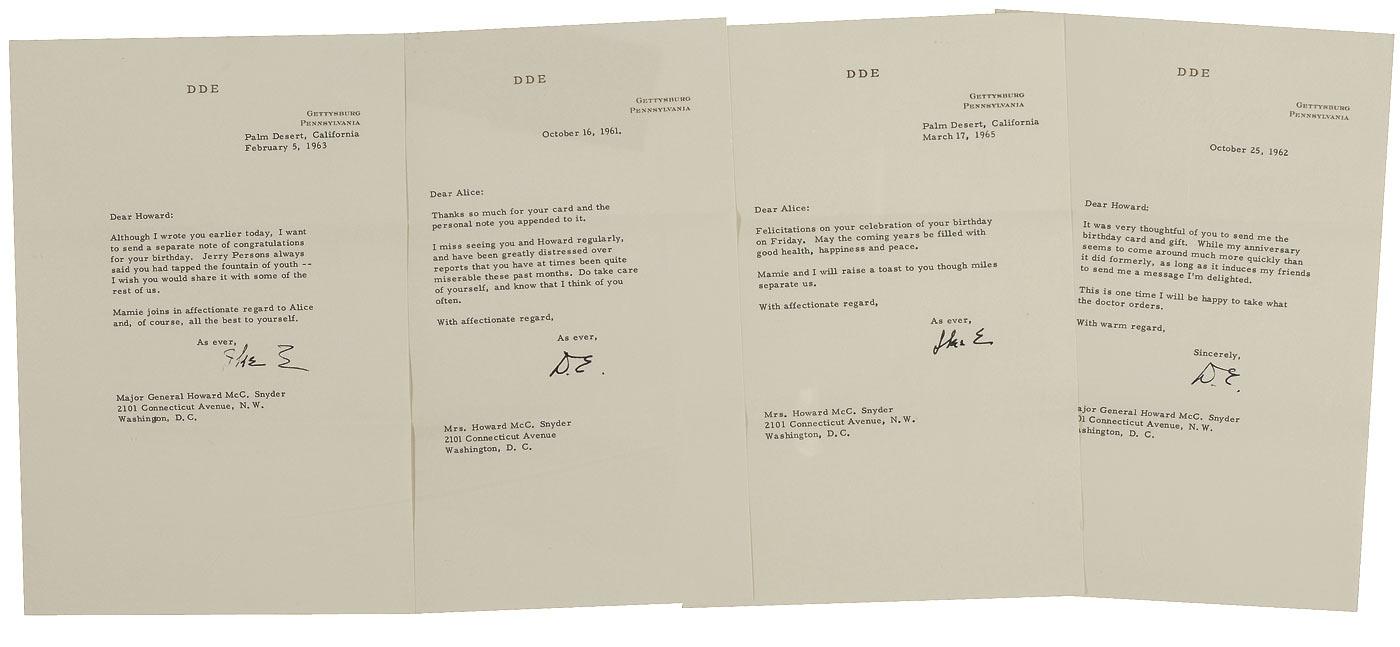 Four one-page TLSs, each signed “D. E.,” all on his personal embossed letterhead, ranging in date from 1961 up to 1965, all written to General or Mrs. Howard Snyder. All letters send birthday and anniversary wishes and get well wishes. All are accompanied by their original transmittal envelopes. In very good condition, with scattered toning. Pre-certified John Reznikoff/PSA/DNA and RRAuction COA.