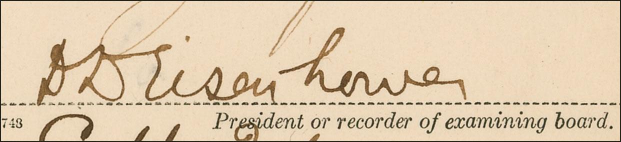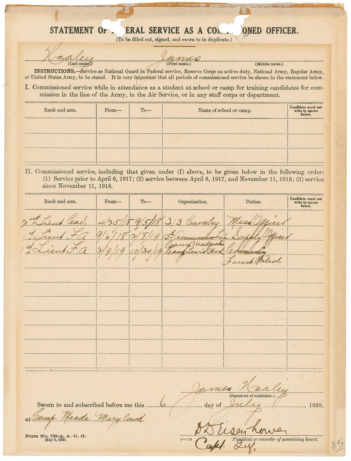 DS, signed “D. D. Eisenhower, Capt. Inf,” one page, 8 x 10.5, July 6, 1920. Statement of federal service as a commissioned officer for James Kealy, listing his federal service for the past two years as a Mess Officer, Supply Officer, and Commanding Forest Patrol. Signed at the conclusion by Eisenhower at Camp Meade in Maryland. In very good condition, with punch holes to top edge, scattered toning from previous display, a couple edge tears and partial fold separations, and tape remnant along top edge of reverse. Pre-certified John Reznikoff/PSA/DNA and RRAuction COA.