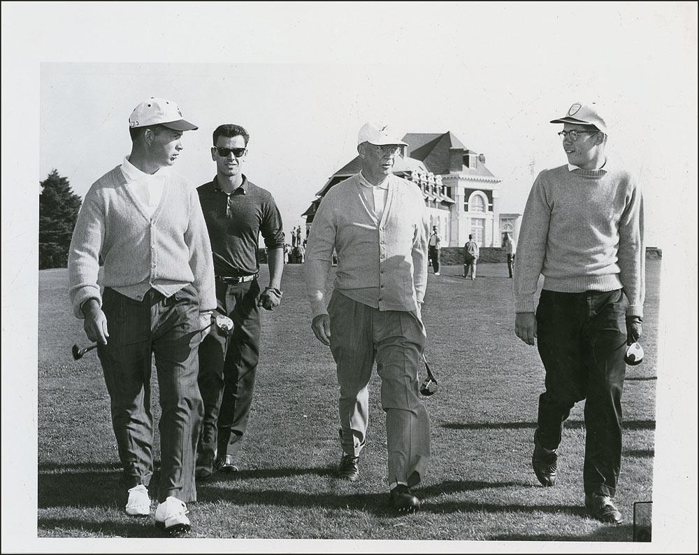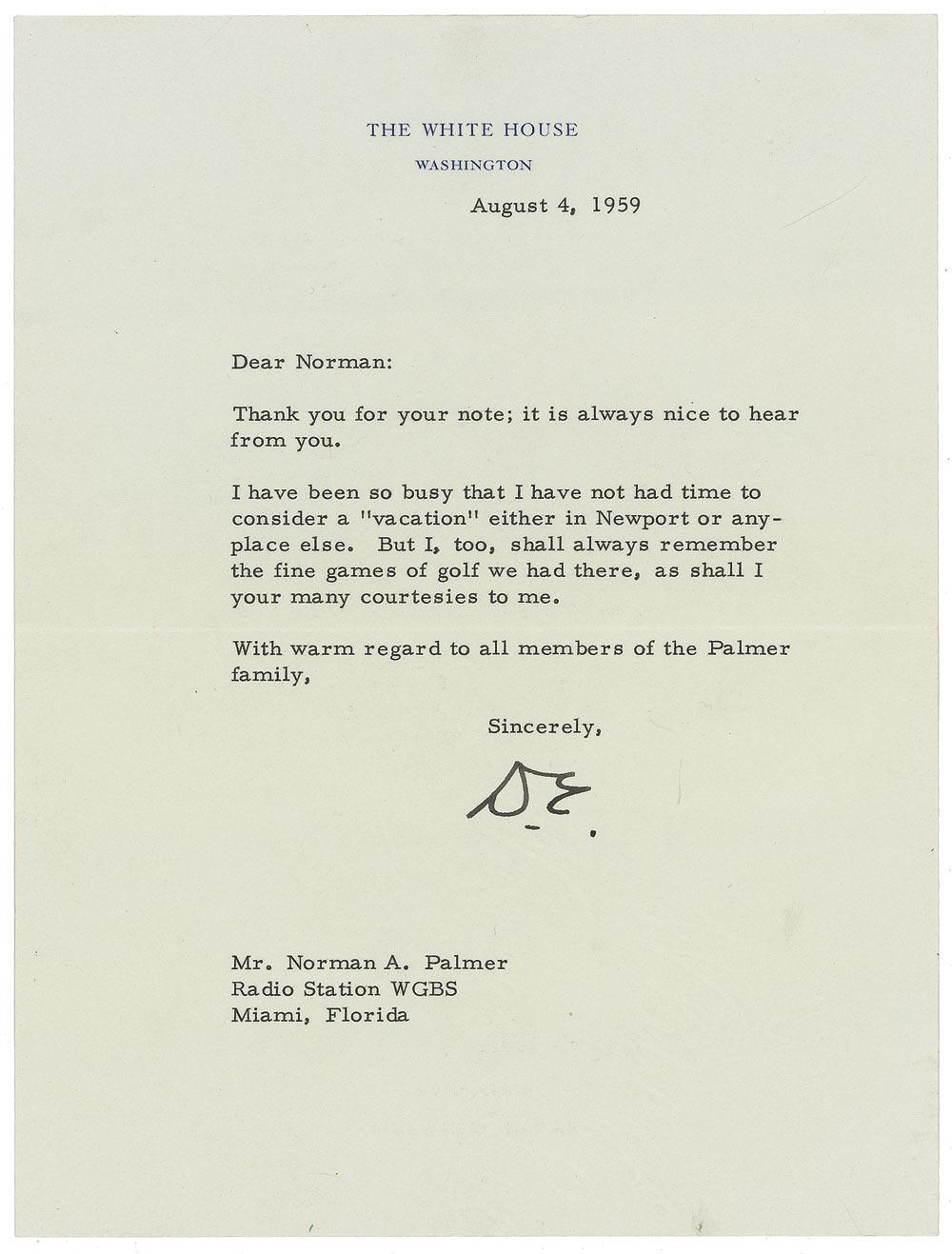 TLS as president signed “D. E.,” one page, 6.75 x 9, White House letterhead, August 4, 1959. Letter to Norman Palmer at a radio station in Miami. In part: “I have been so busy that I have not had time to consider a ‘vacation’ either in Newport or any place else. But I, too, shall always remember the fine games of golf we had there, as shall I your many courtesies to me.” Accompanied by the original mailing envelope, as well as an unsigned photo of Eisenhower on the golf course. In fine condition. Pre-certified John Reznikoff/PSA/DNA and RRAuction COA.