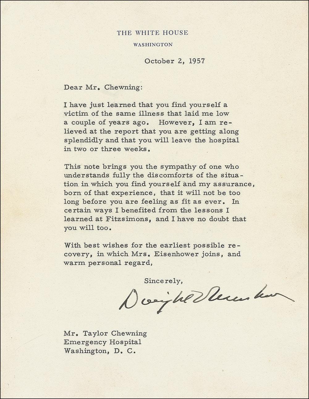TLS as president, one page, 6.75 x 8.75, White House letterhead, October 2, 1957. Get well letter to Taylor Chewning. In part: “I have just learned that you find yourself a victim of the same illness that laid me low a couple of years ago. However, I am relieved at the report you are getting along splendidly…This note brings the sympathy of one who understands fully the discomforts of the situation…In certain ways I benefitted from the lessons learned at Fitzsimons, and I have no doubt that you will to.” Letter is affixed to an identical size board. In fine condition, with a bit of scattered light toning. Pre-certified John Reznikoff/PSA/DNA and RRAuction COA.