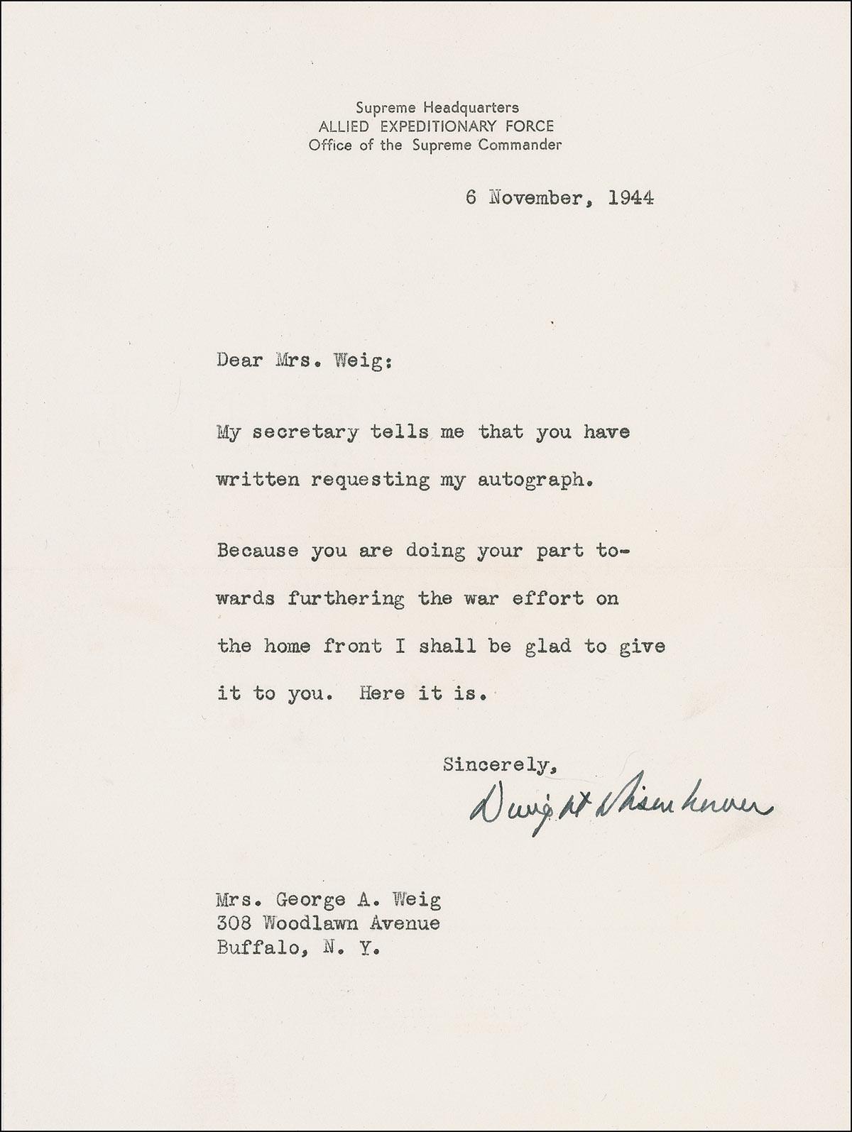 War-dated TLS, one page, 6 x 8, Supreme Headquarters Allied Expeditionary Force letterhead, November 6, 1944. Short letter to a collector seeking an autograph. In part: “Because you are doing your part towards furthering the war effort on the home front I shall be glad to give it to you. Here it is.” In fine condition. Accompanied by the original mailing envelope.