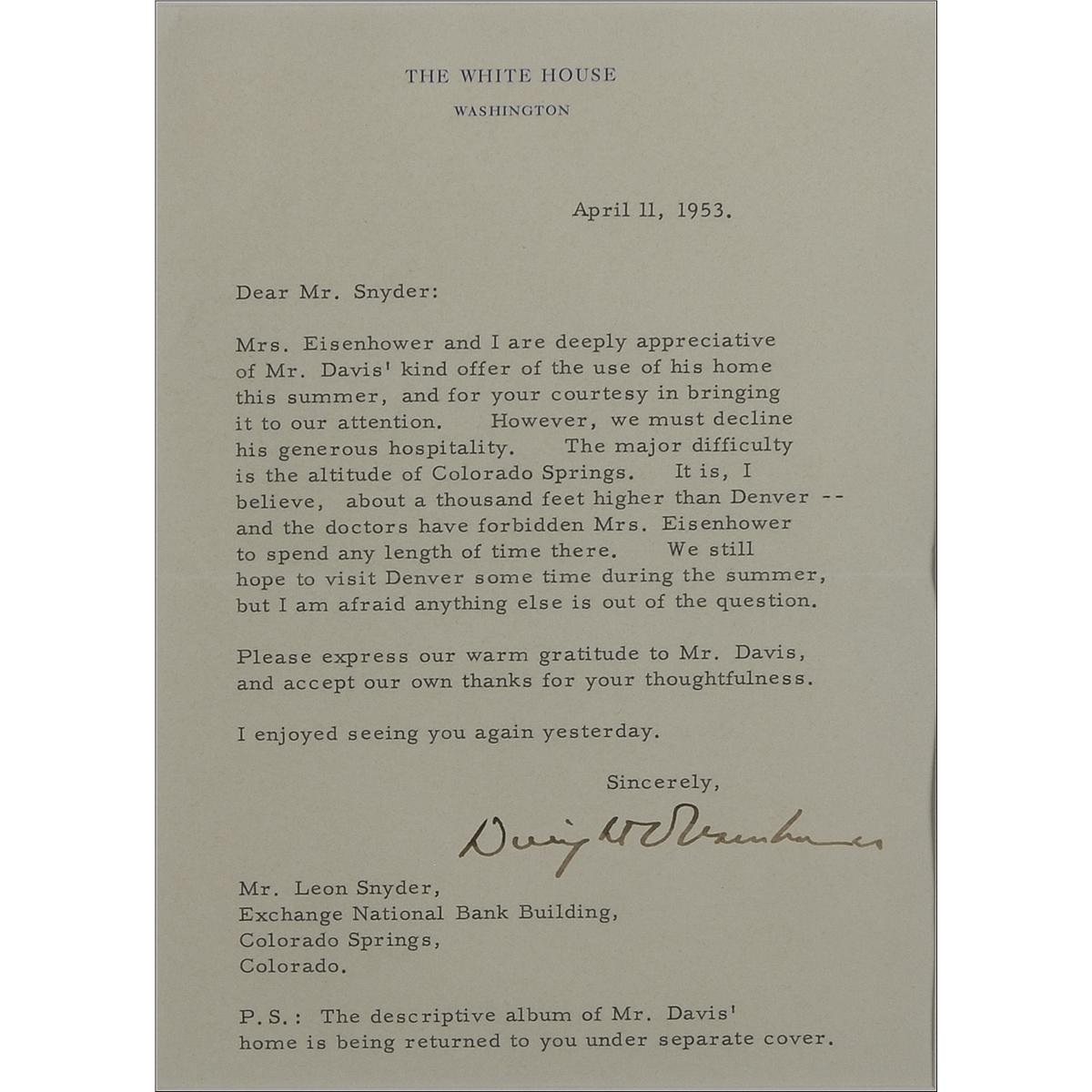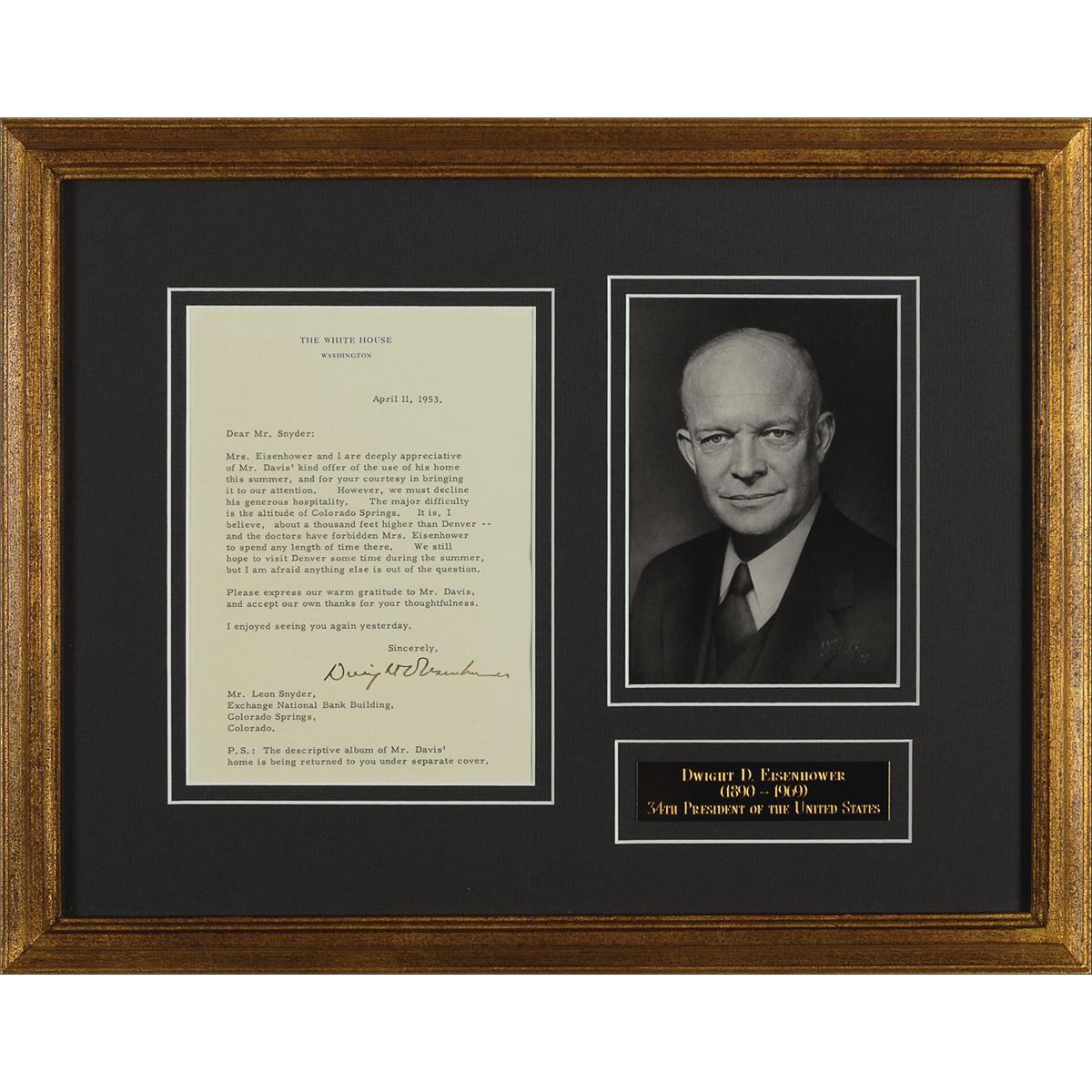 TLS as president, one page, 6 x 8, White House letterhead, April 11, 1953. Eisenhower declines the use of a summer house in Colorado. In part: “Mrs. Eisenhower and I are deeply appreciative of Mr. Davis’ kind offer of the use of his home this summer…However, we must decline his generous hospitality. The major difficulty is the altitude of Colorado Springs. It is, I believe, about a thousand feet higher than Denver—and the doctors have forbidden Mrs. Eisenhower to spend any length of time there.” Archivally double matted and framed with a portrait and name plaque to an overall size of 18.5 x 14.5. In fine condition.