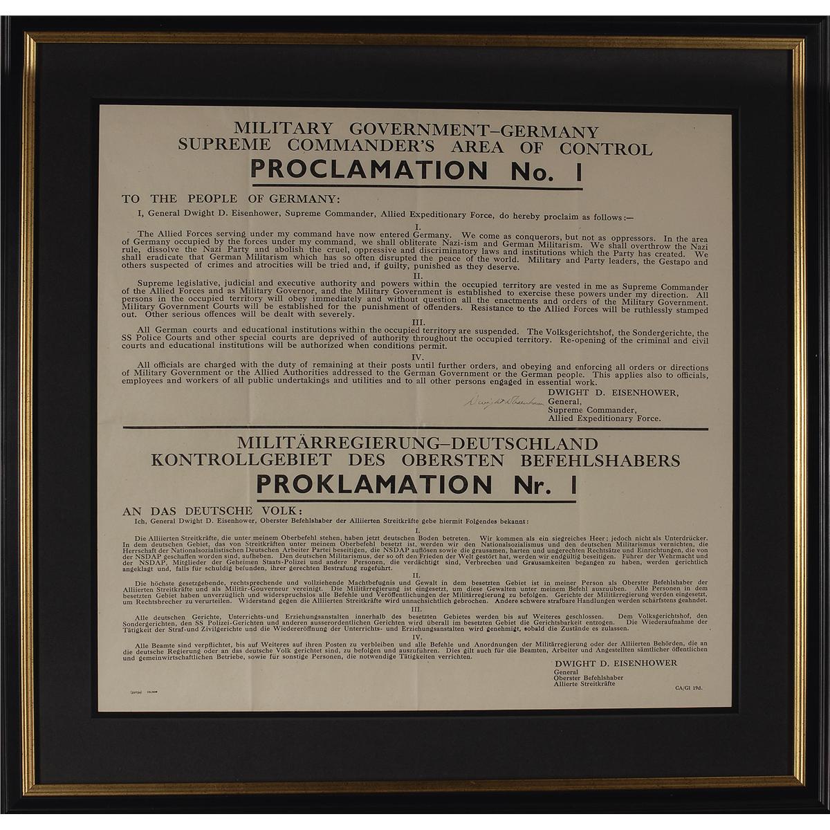 Printed broadside, 20.5 x 19.5, headed “Military Government—Germany, Supreme Commander’s Area of Control, Proclamation No. 1,” in English and German. In full: "To the People of Germany: I, General Dwight D. Eisenhower, Supreme Commander, Allied Expeditionary Force, do hereby proclaim as follows: