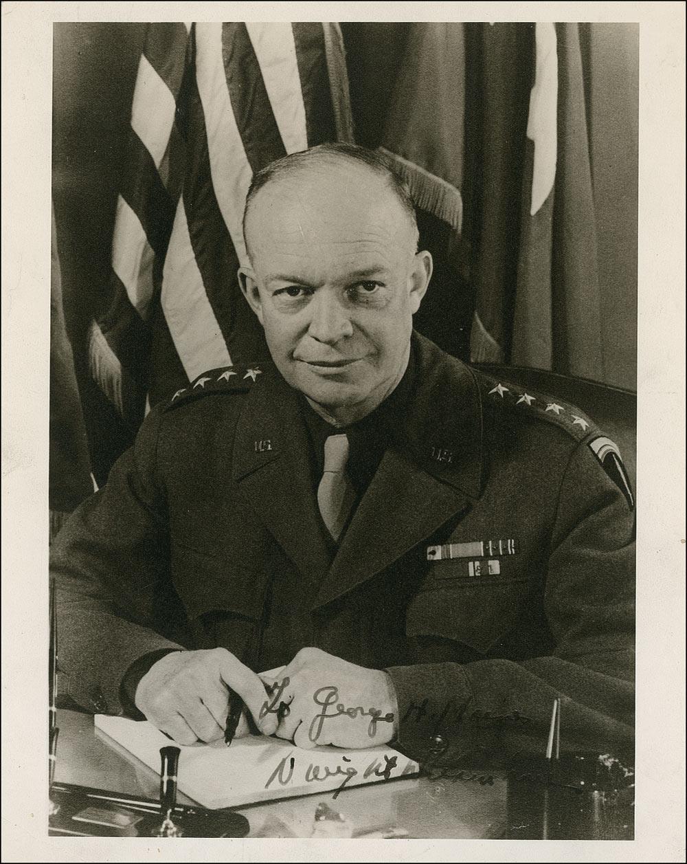 Vintage matte-finish 8 x 10 photo of Eisenhower in full military uniform seated behind his desk, signed and inscribed in fountain pen “To George H. Maines, Dwight D. Eisenhower.” In very good condition, with light to moderate contrast to signature and inscription, and a few scattered small creases. An unusual signed portrait of Eisenhower as a four-star general.