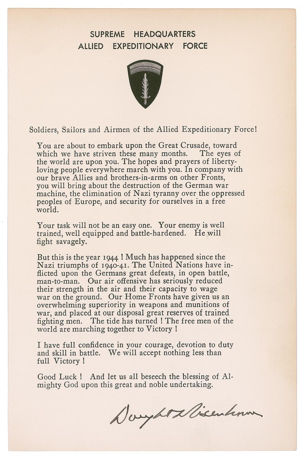 Souvenir D-Day Order removed from one of Eisenhower’s limited edition Crusade in Europe books, 6.25 x 9.25, of General Dwight Eisenhower’s Order of the Day on June 6, 1944, delivered upon the D-Day invasion of France. The order reads, “Soldiers, Sailors and Airmen of the Allied Expeditionary Forces: You are about to embark upon the Great Crusade, toward which we have striven these many months. The eyes of the world are upon you. The hopes and prayers of liberty-loving people everywhere march with you. In company with our brave Allies and brothers-in-arms on other Fronts you will bring about the destruction of the German war machine, the elimination of Nazi tyranny over oppressed peoples of Europe, and security for ourselves in a free world. Your task will not be an easy one. Your enemy is well trained, well equipped and battle-hardened. He will fight savagely. But this is the year 1944! Much has happened since the Nazi triumphs of 1940-41. The United Nations have inflicted upon the Germans great defeats, in open battle, man-to-man. Our air offensive has seriously reduced their strength in the air and their capacity to wage war on the ground. Our Home Fronts have given us an overwhelming superiority in weapons and munitions of war, and placed at our disposal great reserves of trained fighting men. The tide has turned! The free men of the world are marching together to Victory! I have full confidence in your courage, devotion to duty and skill in battle. We will accept nothing less than full victory! Good Luck! And let us all beseech the blessing of Almighty God upon this great and noble undertaking.” Boldly signed at the conclusion in black ink, “Dwight D. Eisenhower.” In fine condition, with mild edge toning, and a vertical crease along left edge. A remarkable piece transcending Eisenhower’s appeal as president and military leader, highlighting perhaps his single greatest achievement