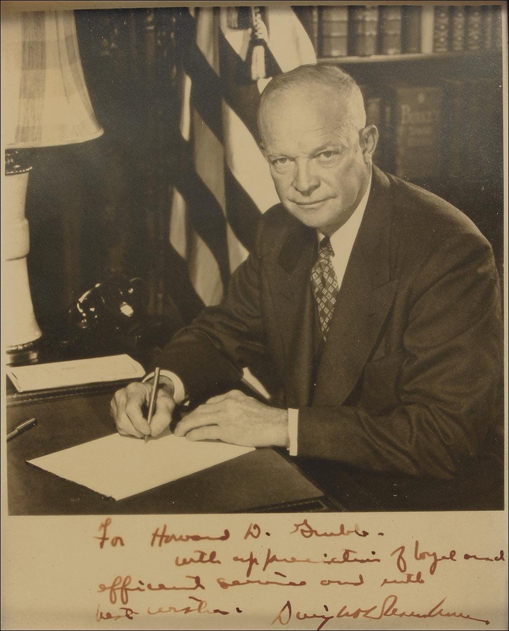 Vintage matte-finish 8 x 10 photo, signed and inscribed in black ink “For Howard D. Grubb, with appreciation of loyal and efficient service and with best wishes. Dwight D. Eisenhower.” Framed to an overall size of 8.75 x 10.75. A uniform shade of toning, and a crack to edge of frame, otherwise fine condition.