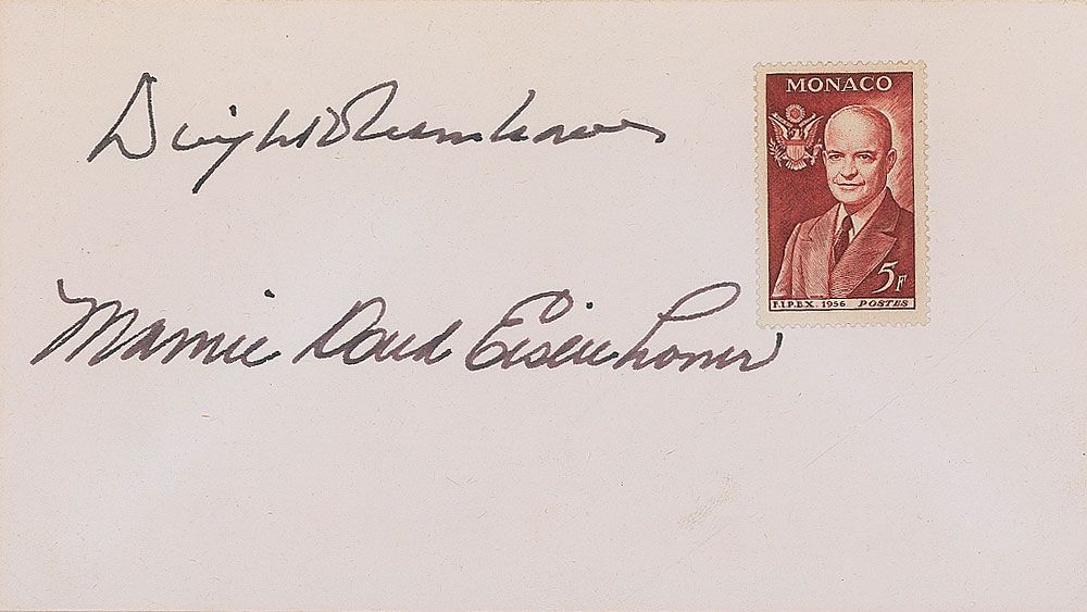 Ink signatures, “Dwight D. Eisenhower,” and “Mamie Doud Eisenhower,” on an off-white 6.5 x 3.5 mailing envelope. In fine condition.