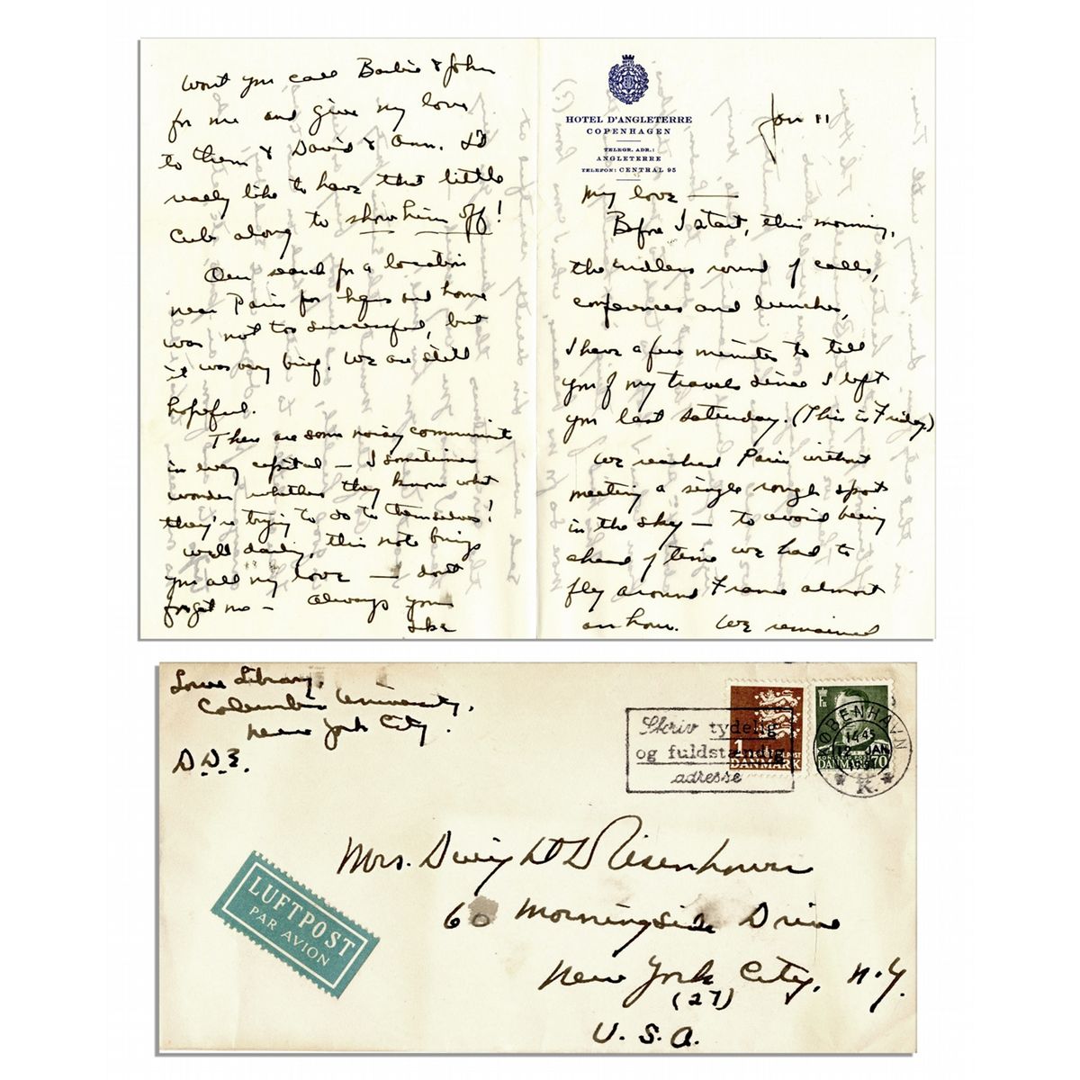 Dwight D. Eisenhower autograph letter signed as Supreme Commander of NATO. Less than 2 years before his election to the Presidency, he writes to his wife, Mamie, on 11 January [1951] on Hotel D'Angleterre, Copenhagen stationery. It reads: ''My love - Before I start, this morning, the endless round of calls, conferences and lunches, I have a few minutes to tell you of my travels since I left you last Saturday. (This is Friday.) We reached Paris without meeting a single rough spot in the sky - to avoid being ahead of time we had to fly around France almost an hour. We remained in that city from Sun. morning until Tues. afternoon, going at a hectic pace. Then we went to Brussells [sic], The Hague, and Copenhagen on one night stands. We shall leave here (weather permitting) right after lunch, landing at Oslo, Norway, about 4:00 p.m. The next day to London, from where I hope to talk to you on the phone...There are letters to write, thank you cards to send, arrangements for a dozen visits each day, trips to and from airports, etc etc. So no one seems to be idle...Our search for a location near Paris for hqs and home was not too successful, but it was very brief. We are still hopeful. There are some noisy communists in every capital - I sometimes wonder whether they know what they're trying to do to themselves!...Always your / Ike''. With original mailing envelope filled out in Ike's hand, addressed to ''Mrs. Dwight D. Eisenhower'' and postmarked 12 January 1951. 4pp. letter on card-style stationery measures 5.75'' x 8.75''. Creasing, else near fine.