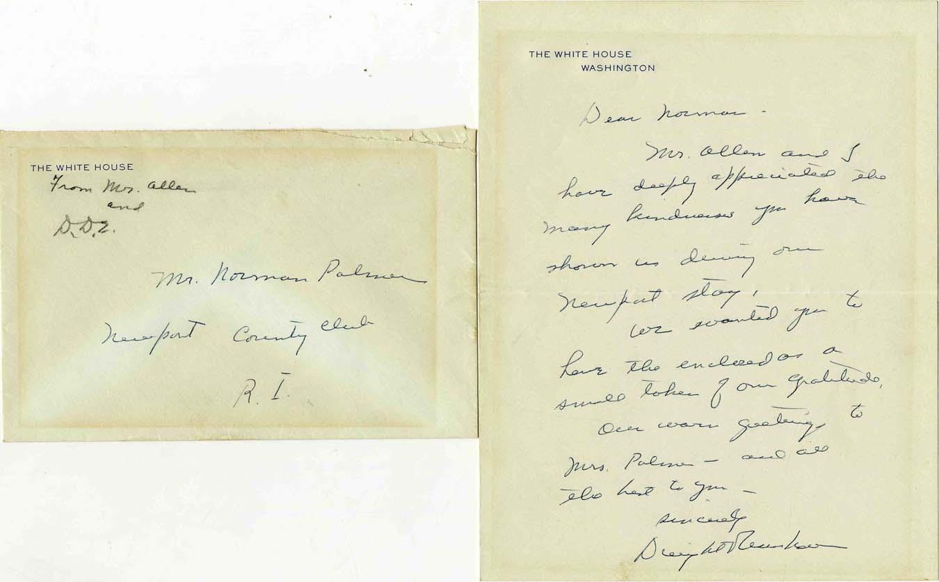 Dwight Eisenhower autograph letter signed as President, undated, though written upon White House stationery, and incredibly rare as such. Eisenhower writes to Norman Palmer, author of ''Five Star Golf,'' in full, ''Mr. Allen and I have deeply appreciated the many kindnesses you have shown us during our Newport stay. We wanted you to have the enclosed as a small token of our gratitude. Our warm greetings to Mrs. Palmer - and all the best to you - Sincerely, Dwight Eisenhower''. Palmer references this letter on page 82 of his 1964 book ''Five Star Golf,'' for which Eisenhower wrote the introduction. Handwritten letters by Eisenhower as President are surprisingly very scarce, even more so on White House stationery. With original envelope addressed in Eisenhower's hand. 7'' x 8.75''. Toning from previous framing, else near fine.