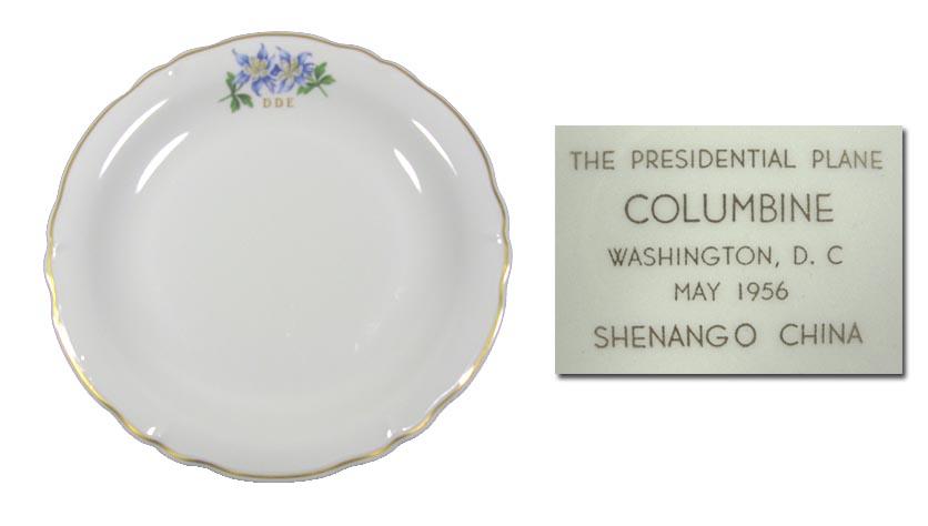 Dwight D. Eisenhower china plate custom-made for use aboard the Presidential plane ''Columbine.'' On the back of the plate is printed, ''The Presidential Plane COLUMBINE Washington, D.C. May 1956 Shenango China.'' Elegant gold-rimmed ivory-colored plate has the initials ''D.D.E.'' painted in gold beneath two blue columbine flowers. Fine condition.