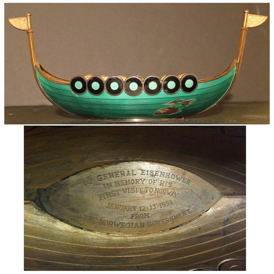 Formal gift from the country of Norway to General Dwight Eisenhower. Decorative keepsake dish fashioned as a Viking ship reads upon the ship's deck, ''To General Eisenhower in Memory of His First Visit to Norway / January 12-13, 1951 From the Norwegian Government''. Boat measures 10'' x 4'' x 3'' with attractive green enamel siding. Accompanied by typed letter initialed ''D.D.E.'' dated 28 February 1968 upon Eisenhower's personal stationery, addressed to a friend to whom he gave the boat. Portion of enamel chipped on one side, else fine.