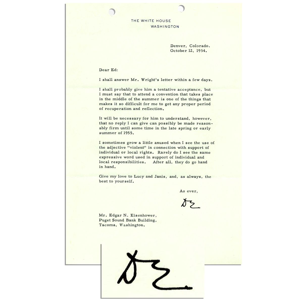 Dwight Eisenhower typed letter signed as President. Dated 12 October 1954, Eisenhower writes on White House letterhead to his brother Edgar and signs ''DE'' in heavy black ink. The letter reads, ''…I sometimes grow a little anused [sic] when I see the use of the adjective 'violent' in connection with support of individual or local rights. Rarely do I see the same expressive word used in support of individual and local responsibilities. After all, they do go hand in hand...'' Measures 7'' x 10.25''. File holes at top, else near fine.
