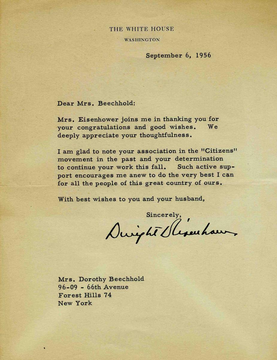 Dwight Eisenhower typed letter signed as President, dated 6 September 1956, on White House stationery. Addressed to a Mrs. Beechhold, letter reads in part: ''…Such active support encourages me anew to do the very best I can for all the people of this great country of ours…'' Signed, ''Dwight D Eisenhower'' boldly in black ink. Letter, measuring 7'' x 9'', has minor toning to edges, else is in very good condition. Also includes White House envelope and three additional letters addressed to Mrs. Beechhold from Eisenhower's secretaries.