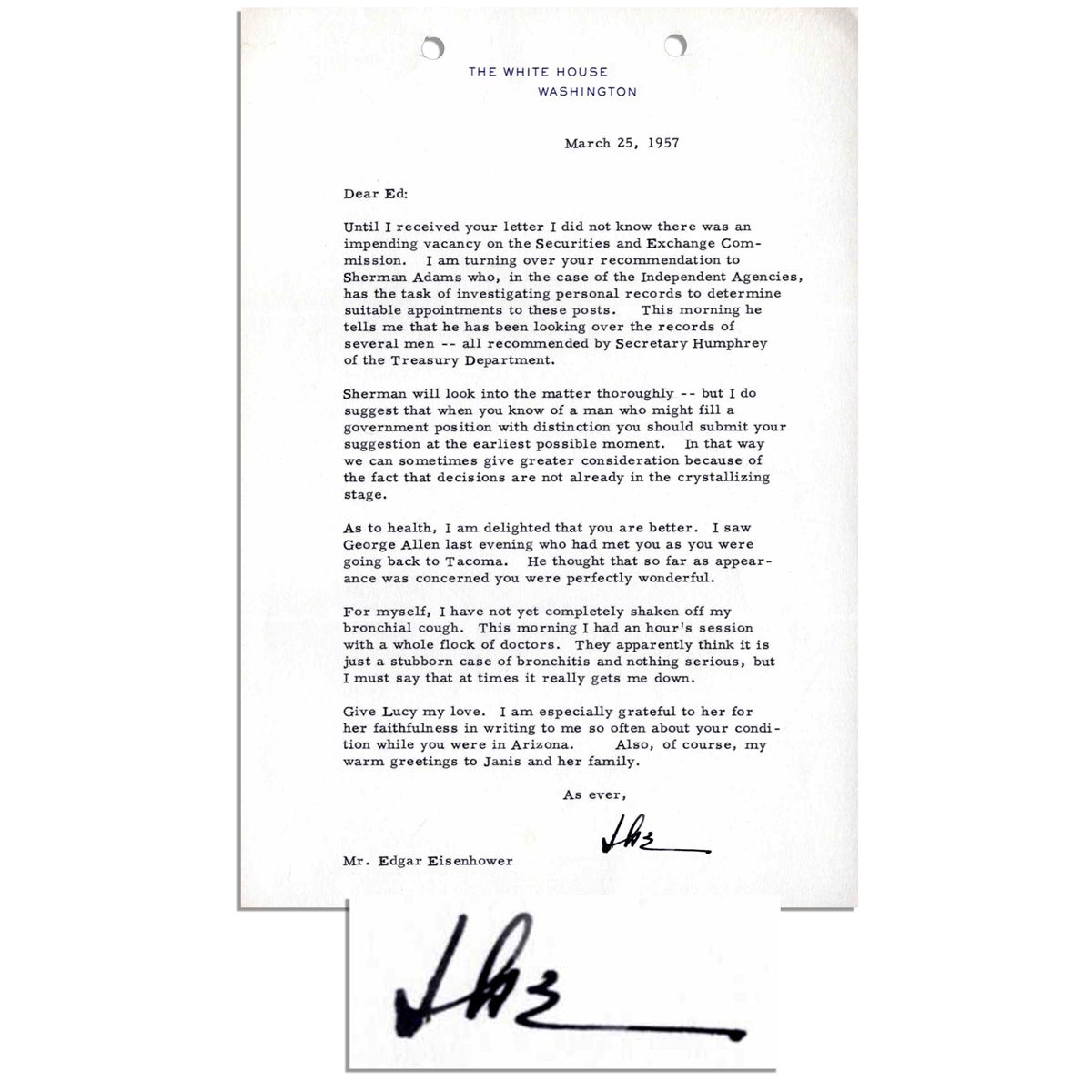 Dwight Eisenhower signs ''Ike'' as President in black marker to a letter typed on White House stationery dated 25 March 1957. Lengthy letter to his brother Edgar focuses primarily on a vacancy in the SEC: ''…Sherman [Adams] will look into the matter thoroughly -- but…when you know of a man who might fill a government position with distinction you should submit your suggestion at the earliest possible moment…[that way] decisions are not already in the crystallizing stage…'' Measures 7'' x 10.5''. Folds and punch holes, else near fine.