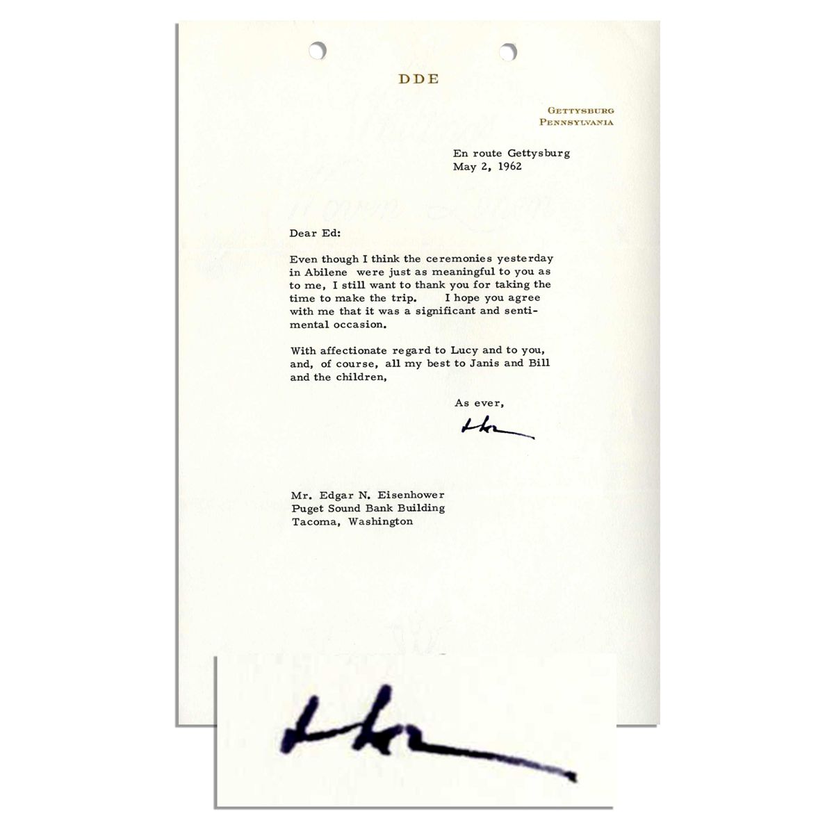Dwight Eisenhower signs ''Ike'' in black marker to a letter datelined, ''En route Gettysburg'' 2 May 1962 on his personal gilt-monogrammed stationery. Addressed to his brother Edgar, letter reads, ''…Even though I think the ceremonies yesterday in Abilene [for the Eisenhower Center] were just as meaningful to you as to me…thank you for taking the time to make the trip…it was a…sentimental occasion…'' A copy of Edgar's warm response letter is included. Measures 7.25'' x 10.25''. Standard folds and punch holes, else near fine.