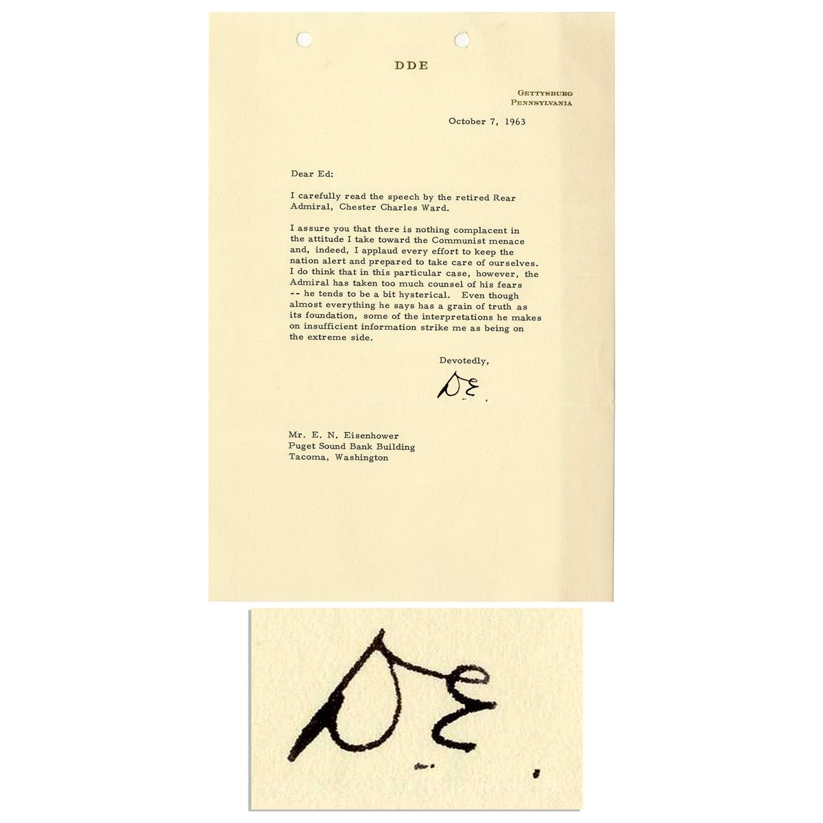 Dwight D. Eisenhower typed letter signed, dated 7 October 1963 on his personal stationery. Here, Eisenhower writes to his brother, Edgar, discussing a retired Rear Admiral, Chester Charles Ward, and his hysteria over Communism: ''…I applaud every effort to keep the nation alert and prepared to take care of ourselves…the Admiral has taken too much counsel of his fears -- he tends to be a bit hysterical…'' Signed ''D.E.'' Letter measures 7'' x 10.25'' on one page with two holes punched at top and minor toning. Near fine condition.