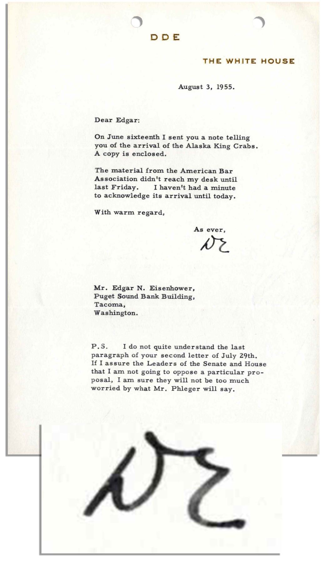 Dwight Eisenhower signs ''DE'' as President to a letter dated 3 August 1955 and typed on his gilded monogram White House stationery, in response to his brother Edgar Eisenhower's letter asking whether the President received ''...the three Alaska King Crabs which I sent to you...'' Dwight confirms that he had received them, continuing ''...The material from the American Bar Association didn't reach my desk until last Friday. I haven't had a minute...until today...'' Measures 7.25'' x 10.5''. Folds and filing punch holes, else near fine.