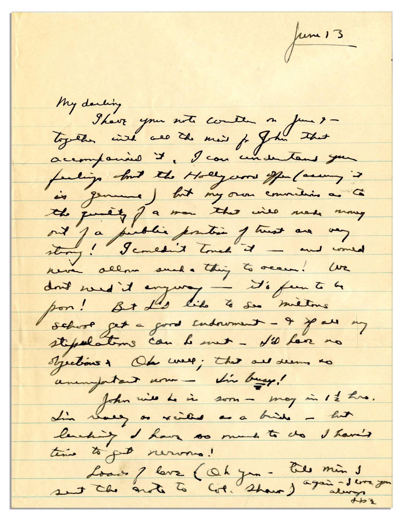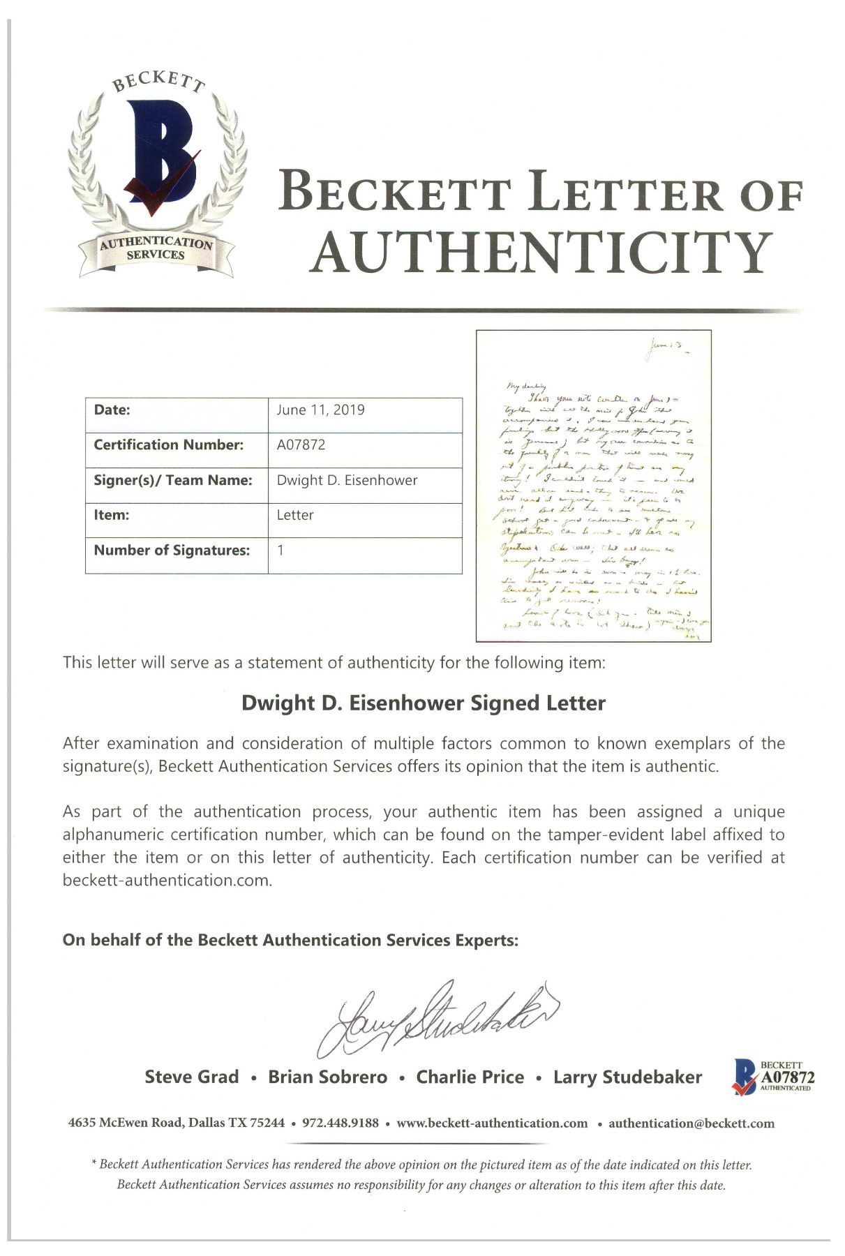 Dwight D. Eisenhower autograph letter signed from WWII, dated 13 June (likely 1945). He writes to his wife Mamie, in part: ''My darling...I can understand your feelings about the Hollywood offer (assuming it is genuine) but my own convictions as to the quality of a man that will make money out of a public position of trust are very strong! I couldn't touch it - and would never allow such a thing to occur! We don't need it anyway - it's fun to be poor! But I'd like to see Miltons school get a good endowment - & if all my stipulations can be met - I'd have no objections. Oh well; that all seems so unimportant now...Loads of love...again - I love you / always / Ike''. Single page letter on ruled stationery measures 8'' x 10.5''. Toning and creasing, else near fine. With Beckett COA.