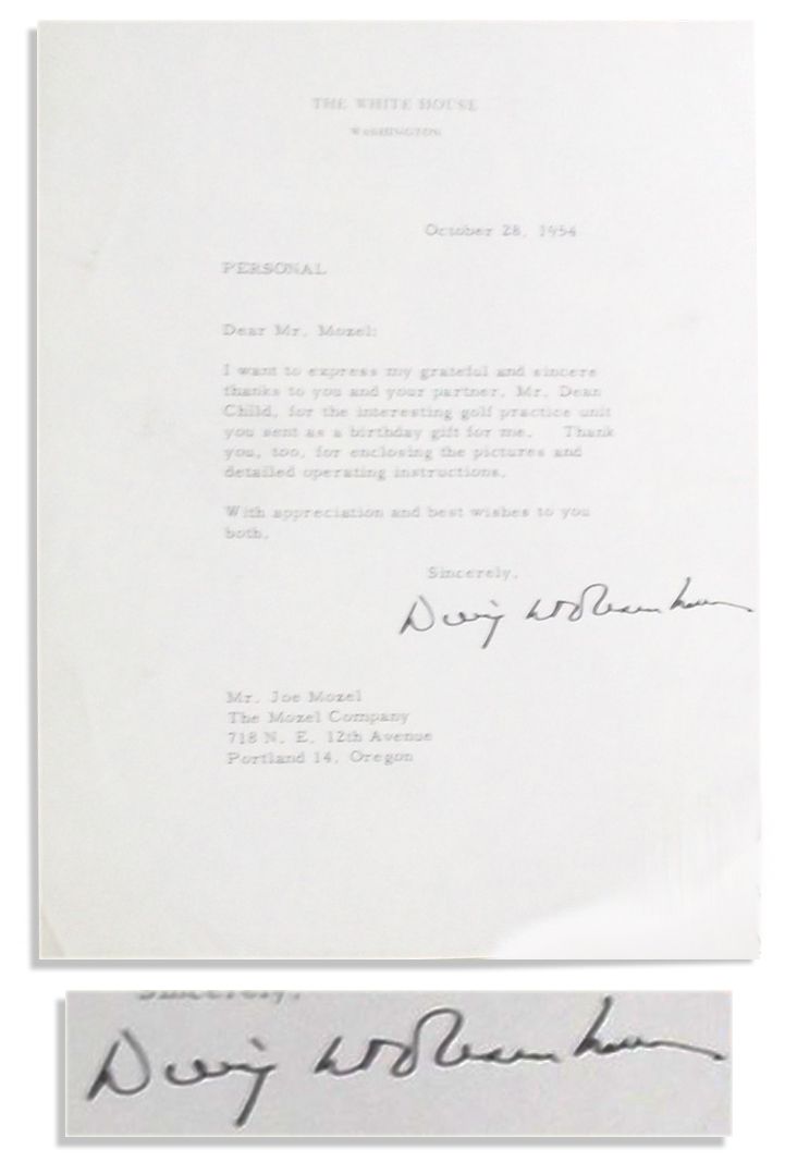 Dwight D. Eisenhower WWII autograph letter signed as General. Just 2 weeks before D-Day, on 24 May [1944] he writes to his wife, Mamie, in part: ''...You mentioned your wire photo picture. I told you in a former note about receiving it and how much I liked the one of you. It is being framed to hang in my office...aside from all other jobs I have to do a recording for the British Broadcasting Company, and 2 movie tone appearances. What a chore! One talk is 3 minutes; the other 1 minute each. But they consume time in preparation, because one must be exceedingly careful of words!!! When this war is over I'm going to swear off speeches, writings, etc etc. I often wonder what you'd like to have me write about. There seems so little I can say in which you'd be interested. If I could talk about my daily doings, I know you'd be intrigued - but I cannot...I'm sending along a news photo they've just made of me. It is for your private room - so I've written on it what I meant - not something to show about. This is a hectic day - but I have time to want you & miss you and to hope you're well. I love you only - / Always / Ike''. 2pp. letter on ruled stationery measures 8'' x 10.5''. Toning and creasing, with a tiny chip to the top of the first page, else near fine.