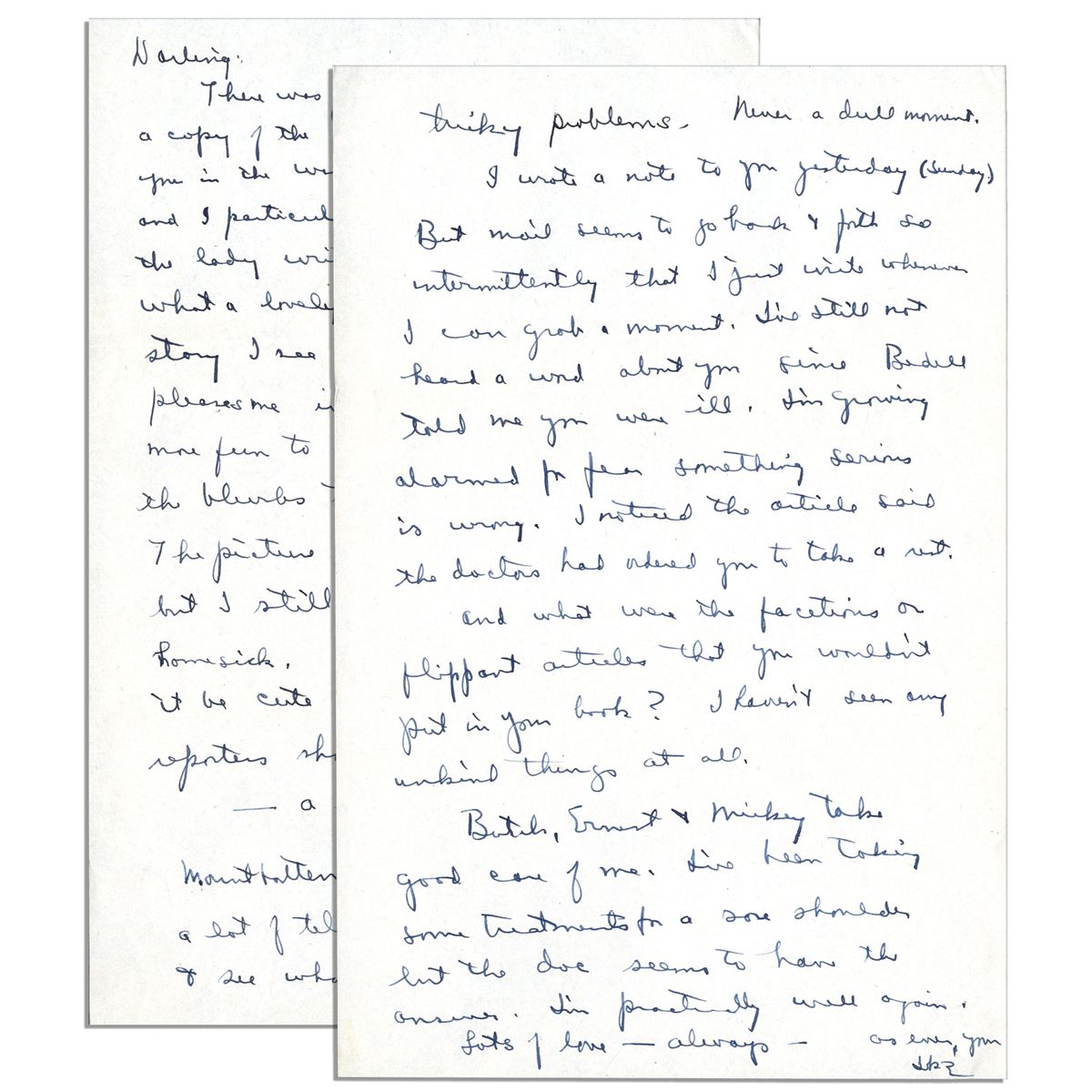 Dwight D. Eisenhower autograph letter signed to his wife Mamie, circa 1942. It reads in part: ''Darling, There was just sent to me (Adm Stark) a copy of the article that was written about you in the Wash. Post of Aug. 2. I like it - and I particularly liked the fact that the lady writing it sensed so quickly what a lovely lady you are. Any story I see about you, and my family pleases me immensely - it's much more fun to read them than some of the the blurbs they concoct about me. The picture of you was not so good - but I still liked it. Made me homesick. By the way - wouldn't it be cute if some of the enterprising reporters should interview Johnny??? - a long telephone call from Mountbatten - I've got to look up a lot of telegraphic correspondence to see what I can do about some tricky problems - never a dull moment...what were the facetious or flippant articles that you wouldn't put in your book? I haven't seen any unkind things at all...I've been taking some treatments for a sore shoulder but the doc seems to have the answer...Lots of love - always...Ike''. 2pp. letter on two sheets measures 6'' x 9''. Very light creasing, else near fine.