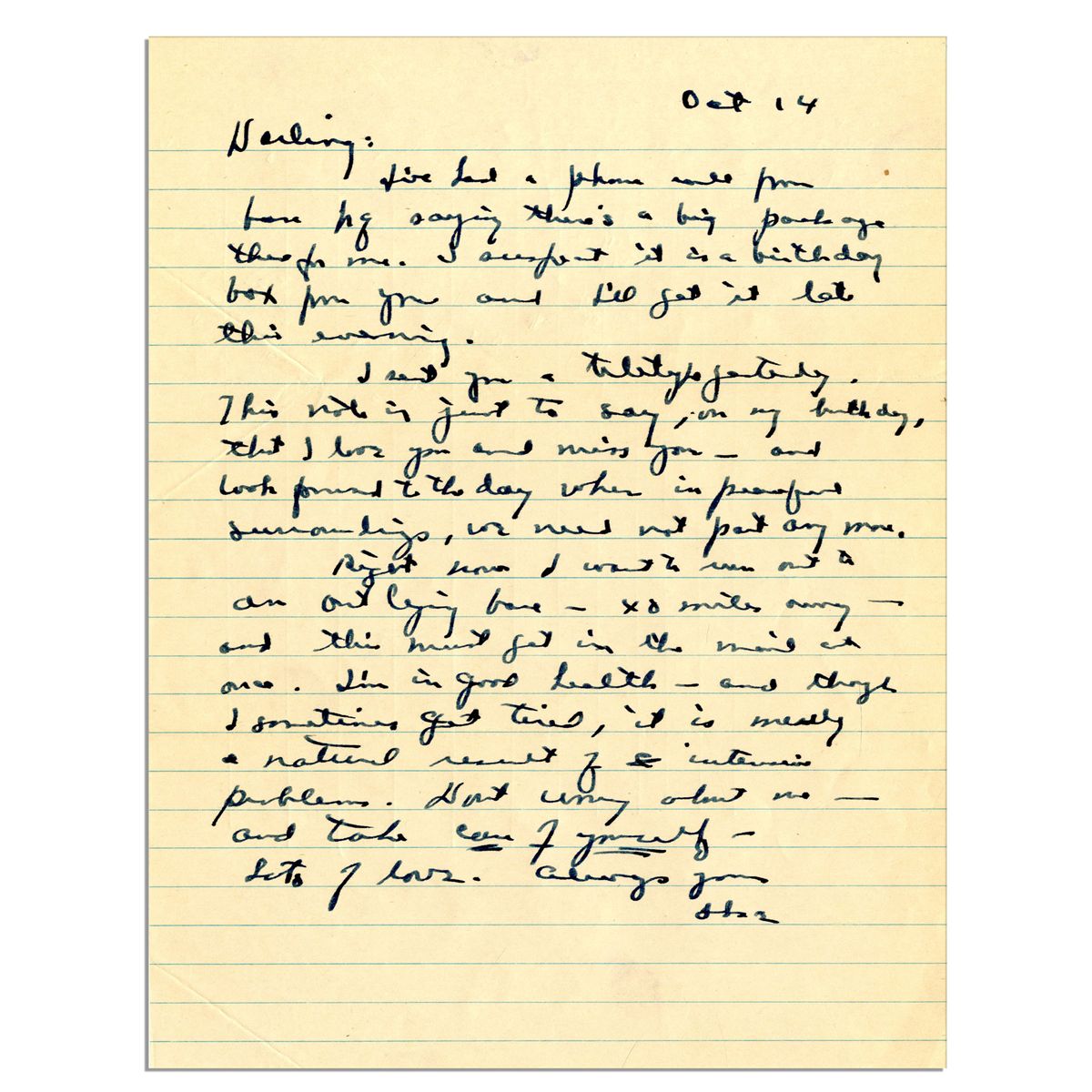 Dwight D. Eisenhower autograph letter signed from Europe during WWII. The general writes to his wife, Mamie, in a letter dated simply 14 October. It reads in part: ''Darling: I've had a phone call from home hq saying there's a big package there for me. I suspect it is a birthday box from you and I'll get it late this evening. I sent you a teletype yesterday. This note is just to say, on my birthday, that I love you and miss you - and look forward to the day when in peaceful surroundings, we need not part any more. Right now I want to run out to an outlying base - 40 miles away - and this must get in the mail at once. I'm in good health - and though I sometimes get tired, it is merely a natural result of intensive problems...Always your Ike''. Single page letter on ruled stationery measures 8'' x 10.5''. Near fine.