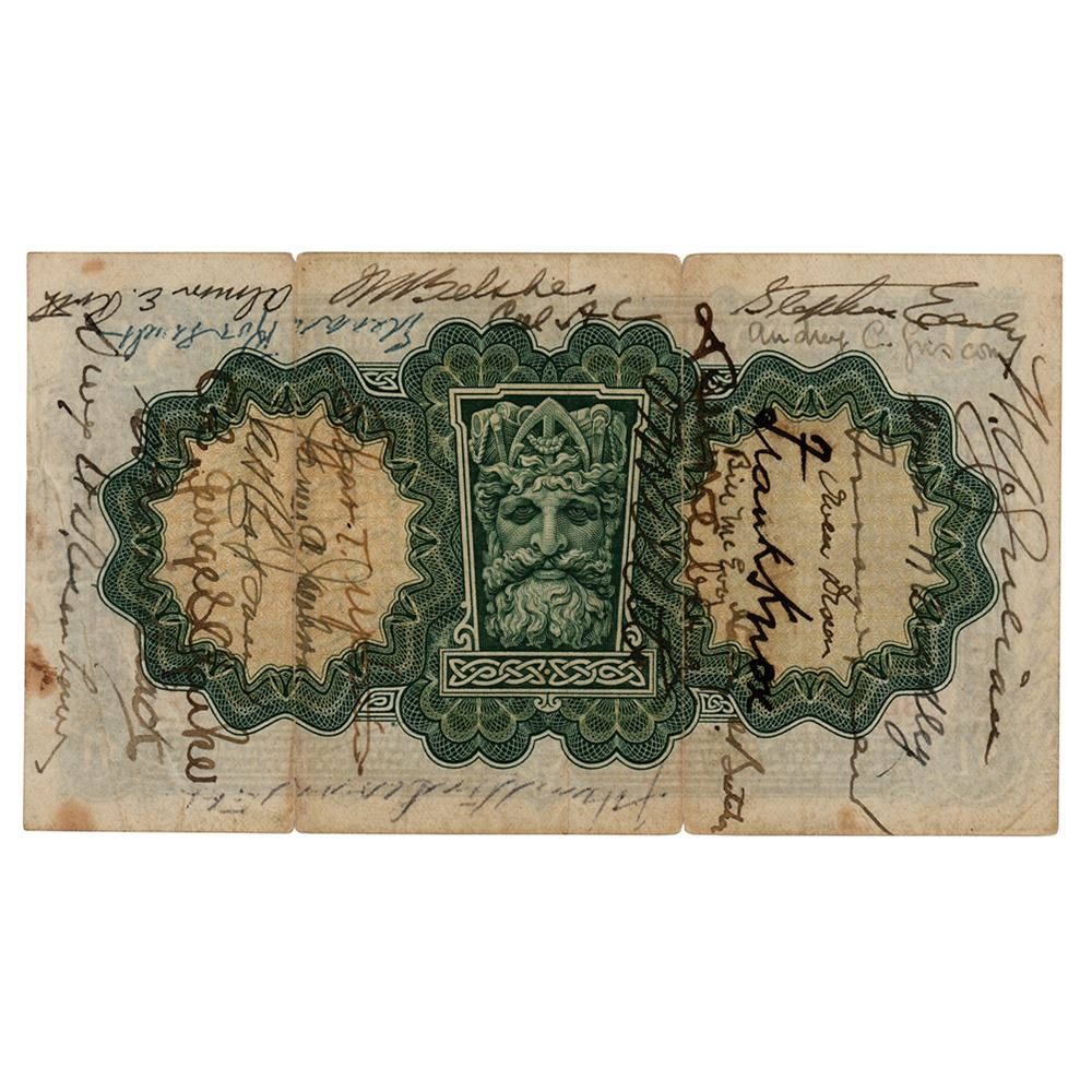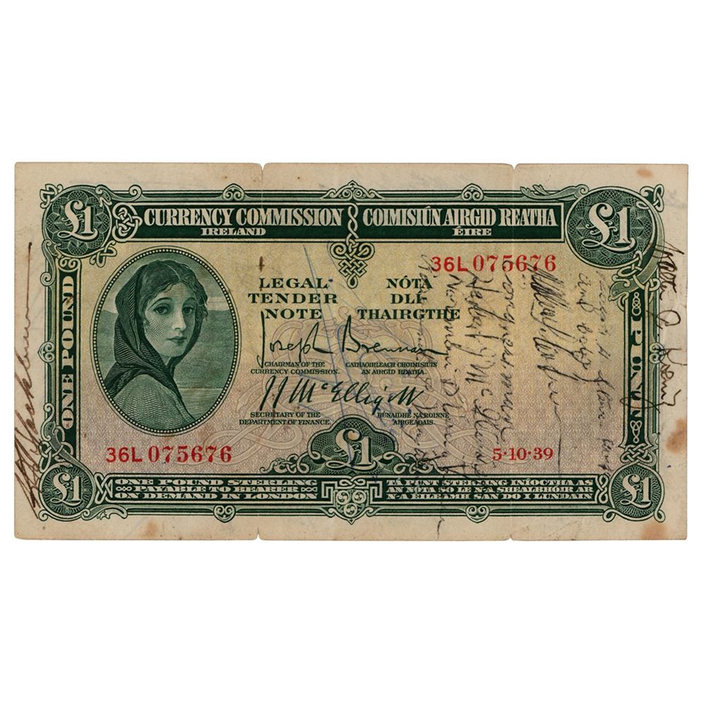 A 1939 Currency Commission of Ireland one pound ‘short snorter’ banknote, 6 x 3.25, signed vertically on the front and back in ballpoint and fountain pen by a number of political dignitaries, highlighted by the presence of Dwight D. Eisenhower, Omar Bradley, and Eleanor Roosevelt. Other signers include Stephen Early (White House press secretary), Frank Knox (Secretary of the Navy), Harry C. Butcher (Naval Aide to General Eisenhower), William Alexander Julian (Treasurer of the United States), Colonel George S. Clarke, Owen Dixon (Chief Justice of Australia), and more. In fine condition, with expected signs of use.