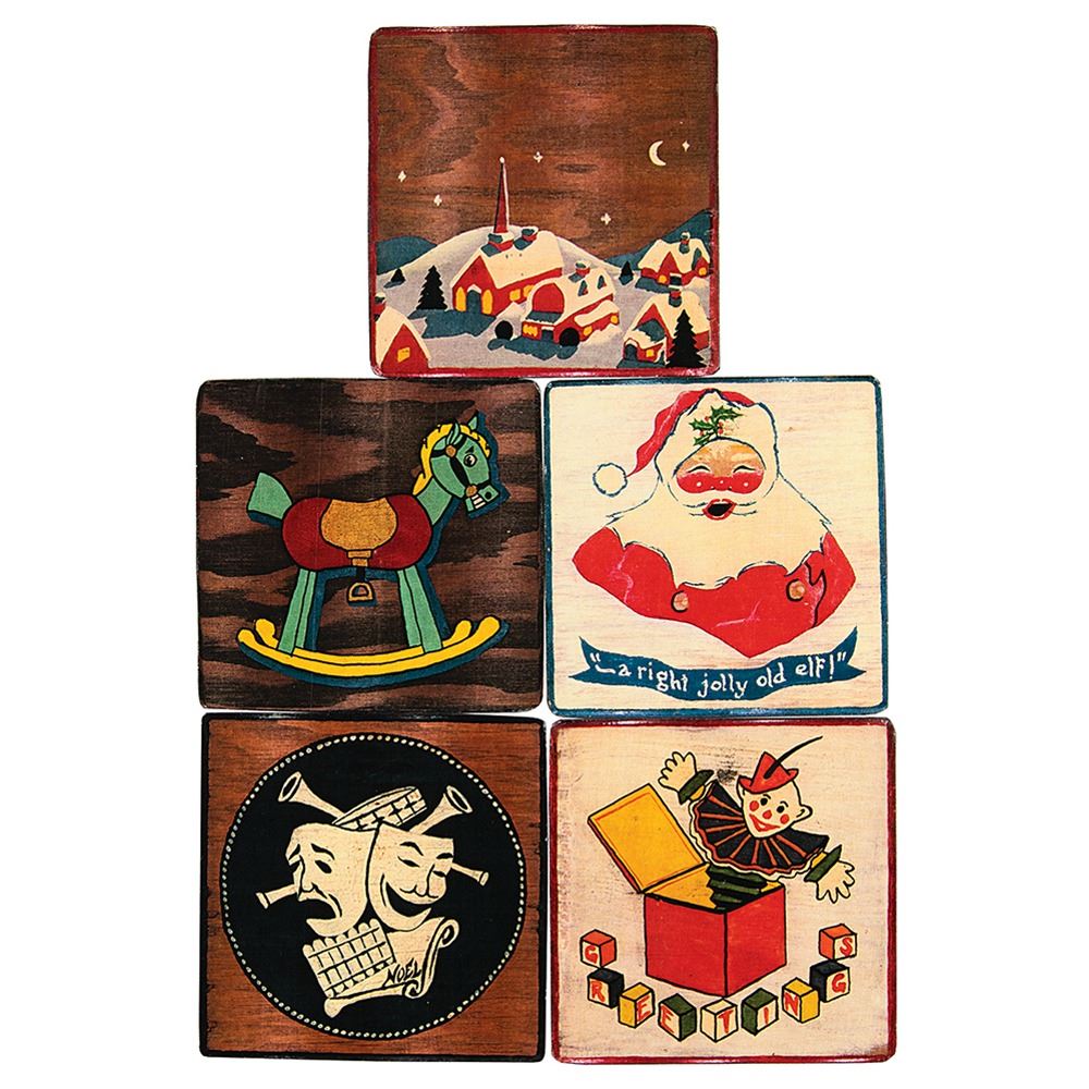 Limited edition set of five wooden Christmas cards hand-made by classic horror character actor Dwight Frye. The second of five issued sets, each coaster-shaped card measures 4 x 4 and has been hand-painted by Frye with mirthful, holiday-themed imagery, such as Santa Claus, a jack-in-the-box, a rocking horse, a snowy town at night, and a comedy and tragedy mask design. The backs of each are annotated “Dwight Frye’s Christmas Cards,” the date they were made (1937-1941), and their edition number. In overall fine condition, with some old mounting residue on the backs of a few.