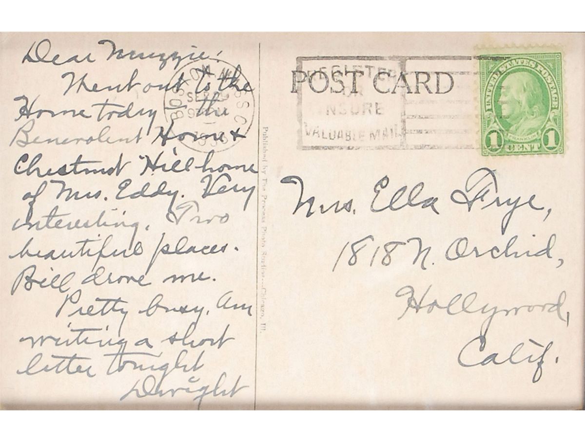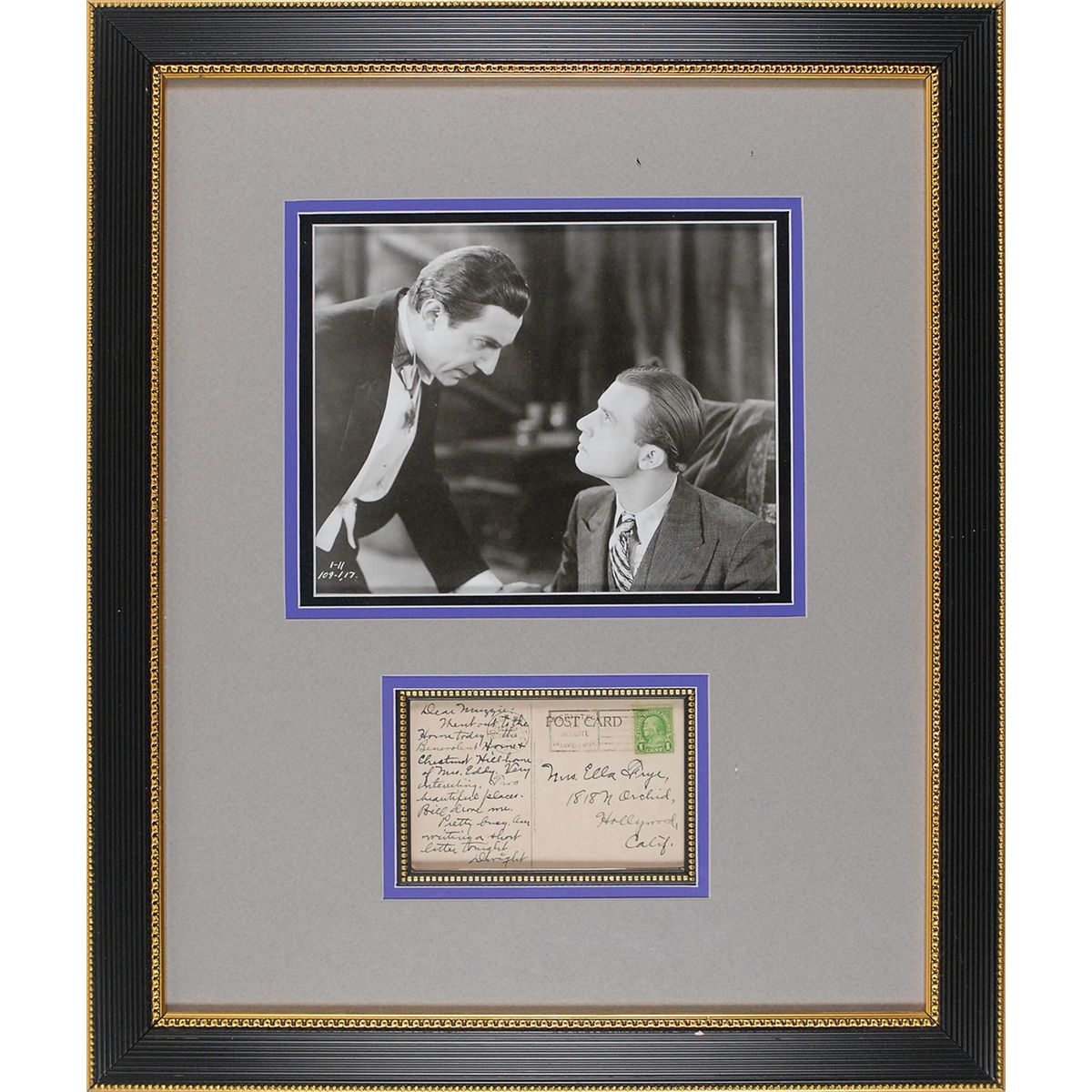 Character actor (1899–1943) who played the lunatic Renfield opposite Bela Lugosi in Dracula, as well as Colin Clive’s assistant Fritz in Frankenstein. Rare ALS signed “Dwight,” one page on a 5.5 x 3.5 postcard, postmarked September 9, 1936. Letter to Mrs. Ella Frye about his trip to Boston. In full: “Went out to the Home today—the Benevolent Home & Chestnut Hill home of Mrs. Eddy. Very interesting. Two beautiful places. Bill drove me. Pretty busy. Am writing a short letter tonight.” In fine condition, with postmark affecting a few words. While this is a rather mundane sightseeing letter at first glance, its implications are quite important—he was visiting landmarks associated with the Christian Science movement, including the home of its founder, Mary Baker Eddy. As a devout Christian Scientist, Frye refused medical treatment for coronary problems, which he also concealed from friends and family, and ultimately passed away from a heart attack at the age of 44. An exceedingly rare and desirable piece from the horror icon, closely associated with his tragic early demise.