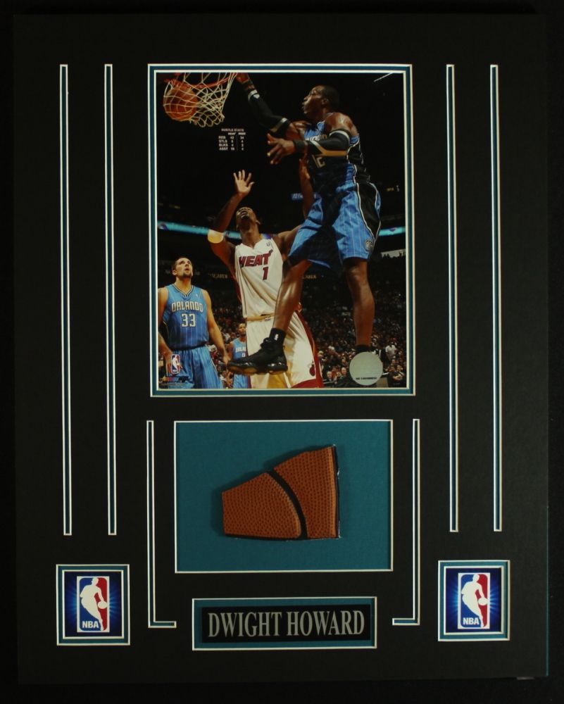 Piece measures 16x20 in size and is highlighted by a piece of basketball. The piece of basketball has been custom matted with an 8x10 photo.