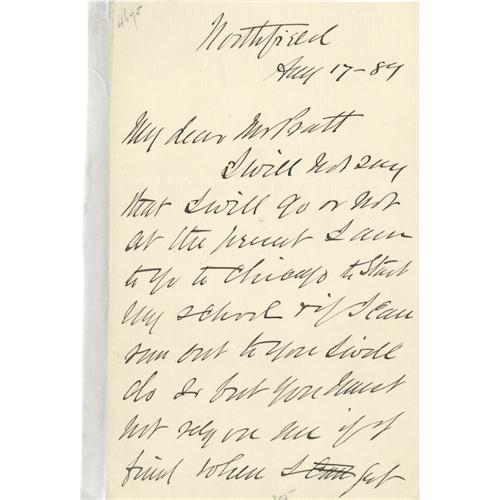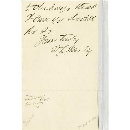 <B>Dwight L. Moody Writes He's on His Way to Start the Moody Bible Institute in Chicago.</B></I> Autograph Letter Signed ("D.L. Moody"), 2 pages, 1st and 4th integral leaves, 5.5" by 8", Northfield, August 17, [18]89. To Mr. Pratt. Strengthened at left margin, otherwise fine. Here the Protestant evangelist sets out to spread his simple, conservative and personal Christianity; clearly, in his focus, a man on a mission. "<I>...I am to go to Chicago to start my school</B></I> [the Moody Bible Institute] <I>& if I can run out to you I will do so but you must not rely on me...</B></I>" From the Henry E. Luhrs Collection. Accompanied by LOA from PSA/DNA.