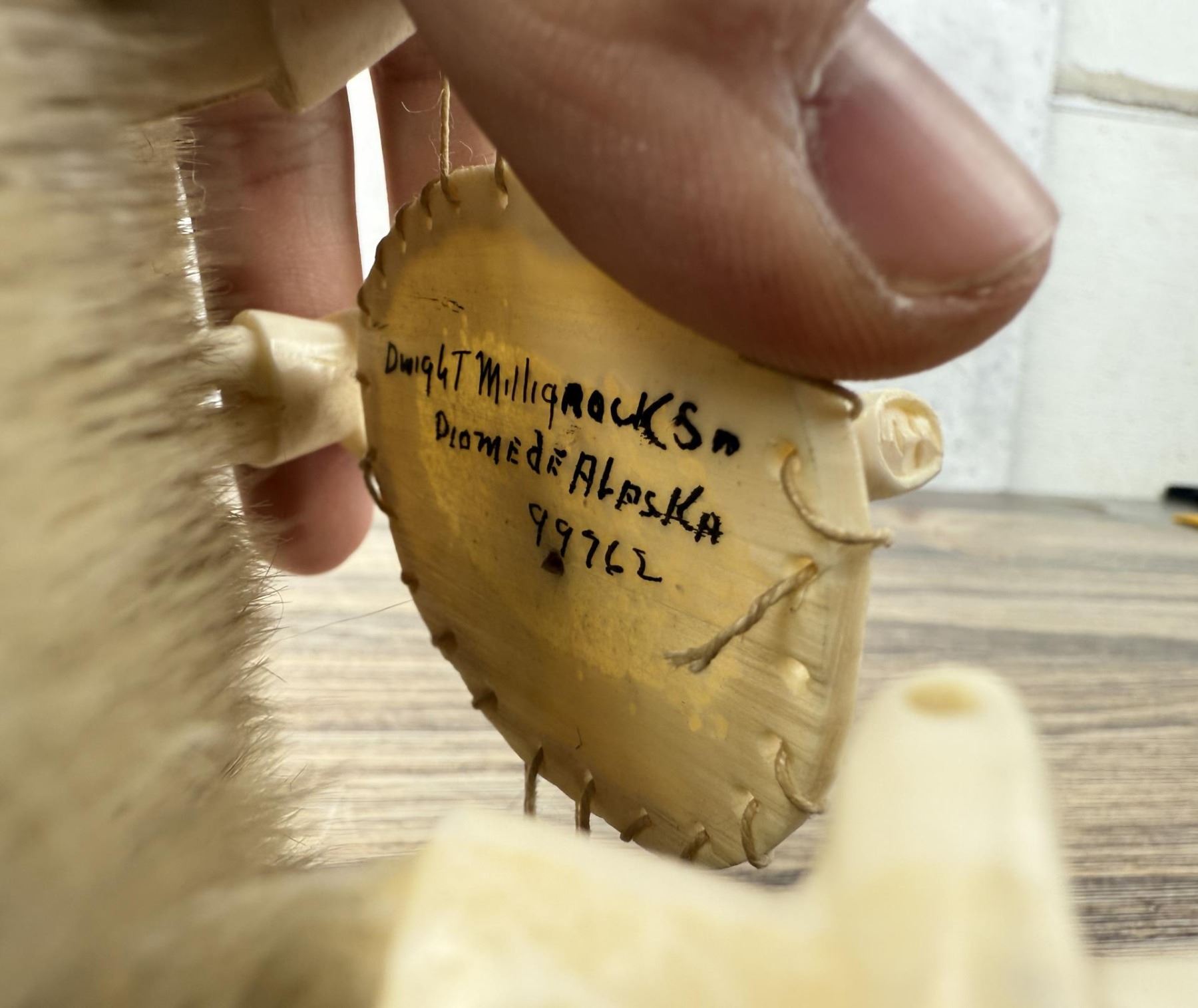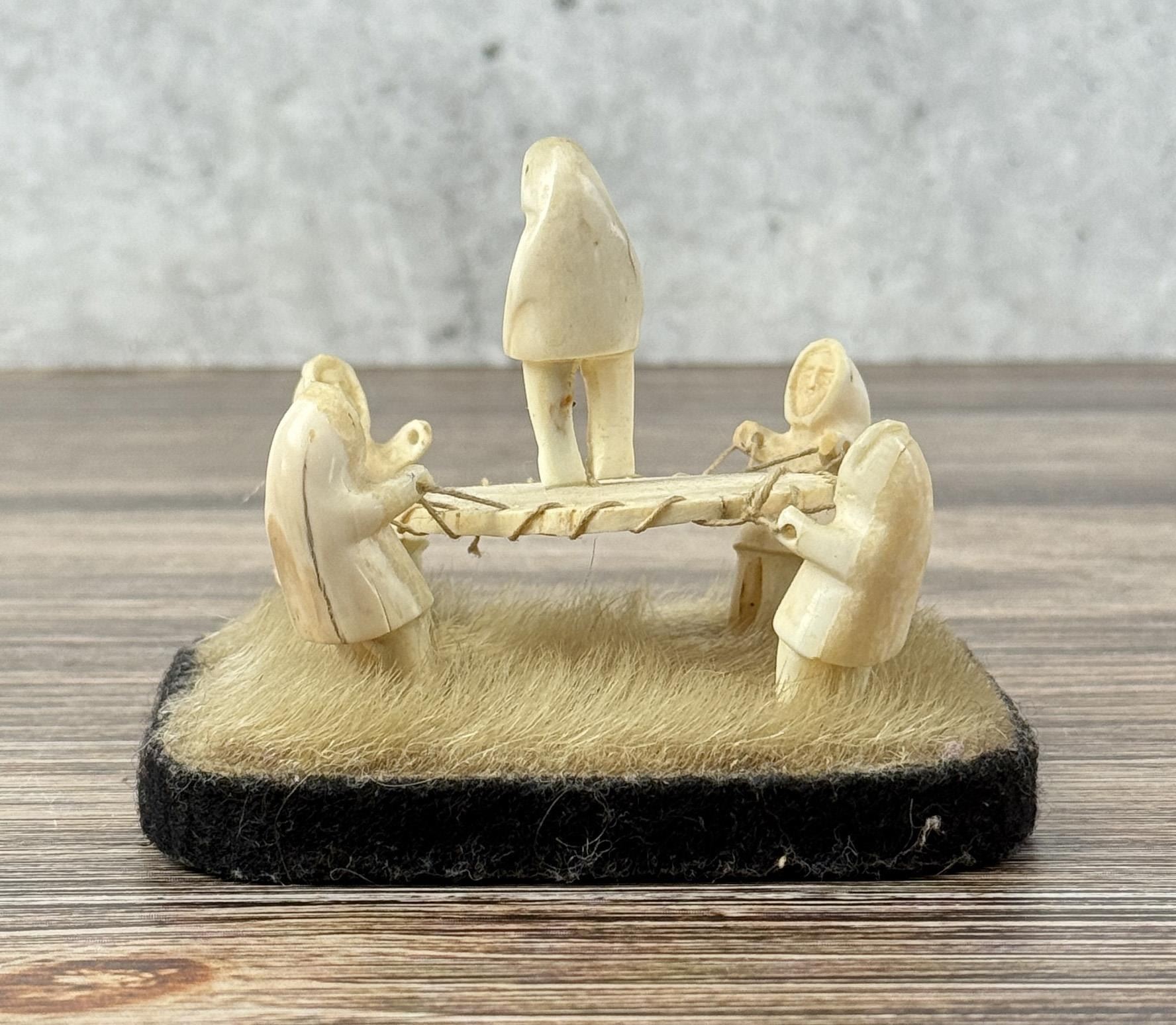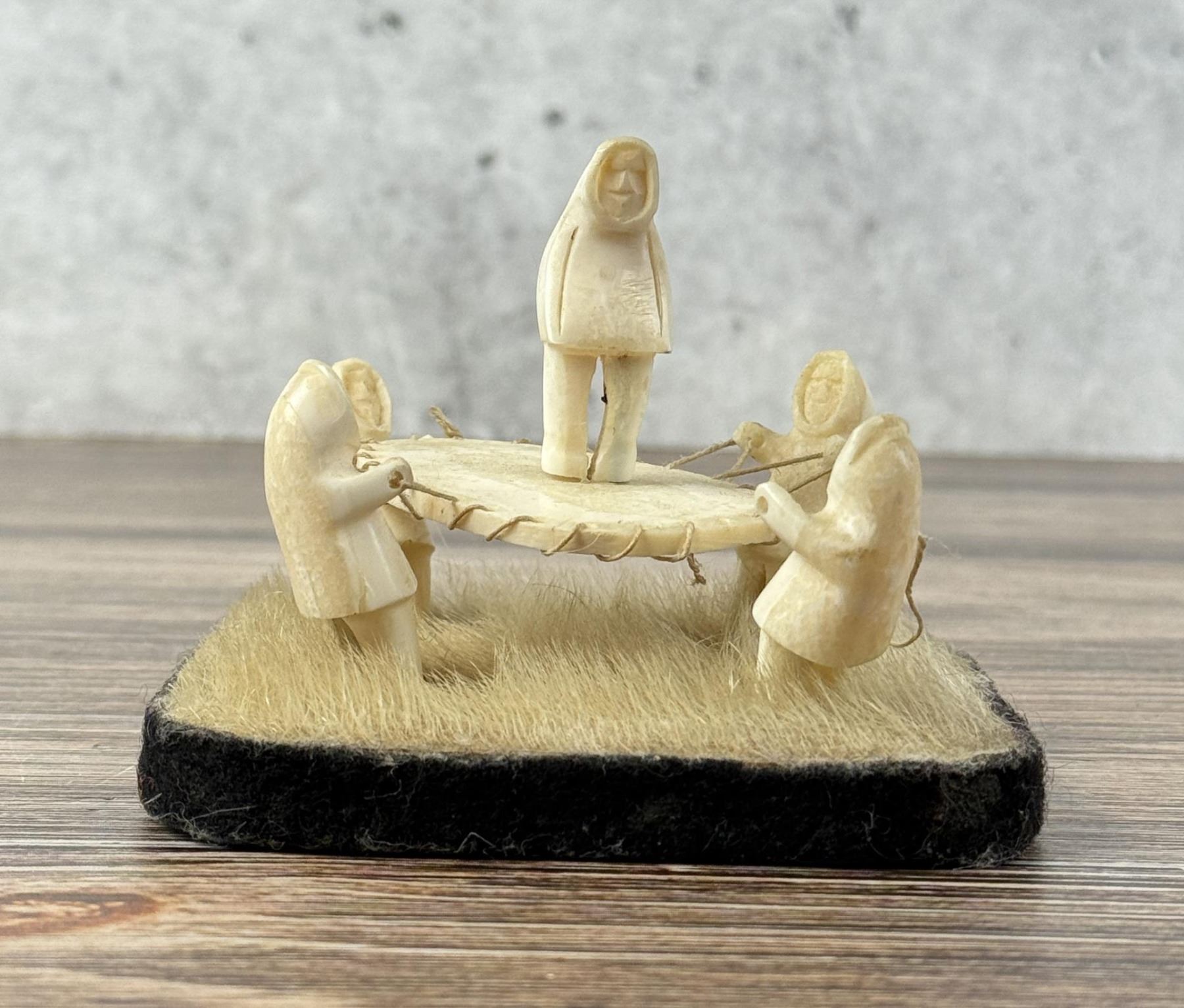 Blanket Toss. 4 1/4" by 4 1/4" by 3 1/4". Carved walrus material. Native made prior to 1972. This item cannot be shipped to Oregon, California, Hawaii, New York, New Jersey, Internationally, or any other state that prohibits.