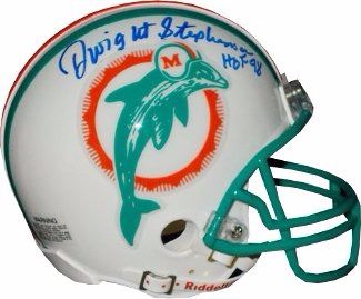 Dwight Stephenson played offensive lineman with the Miami Dolphins and is a member of the Pro Football Hall of Fame's class of 1998. He was voted as an All-Pro five consecutive times from 1983 to 1987. He was selected to play on five Pro Bowl squads over the same span. He started at center in the AFC Championship Game three times, in 1982, 1984, and 1985. He was the starting center in the last two Dolphin Super Bowl appearances:Super Bowl XIX and Super Bowl XVII. Dwight Stephenson has hand autographed this Miami Dolphins TB Replica Mini Helmet with HOF98 Inscription. MAB Hologram and Certificate of Authenticity from Athlon Sports