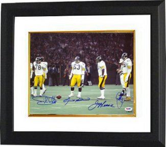 The Steel Curtain was the nickname given to the front four of the famous defensive line of the Pittsburgh Steelers during their 1970s dynasty years. This defense was the backbone of the Steelers dynasty, which won 4 Super Bowls (IX, X, XIII, and XIV). This is a hand autographed Pittsburgh Steelers Steel Curtain 11x14 Photo. 4 Autographs include: Joe Greene, Dwight White (deceased), Ernie Holmes (deceased), and LC Greenwood. PSA Hologram and Certificate of Authenticity. Custom White Mat and Premium Black Color Framed as shown.