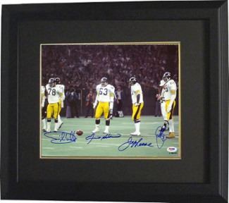 The Steel Curtain was the nickname given to the front four of the famous defensive line of the Pittsburgh Steelers during their 1970s dynasty years. This defense was the backbone of the Steelers dynasty, which won 4 Super Bowls (IX, X, XIII, and XIV). This is a hand autographed Pittsburgh Steelers Steel Curtain 11x14 Photo. 4 Autographs include: Joe Greene, Dwight White (deceased), Ernie Holmes (deceased), and LC Greenwood. PSA Hologram and Certificate of Authenticity. Custom Black Mat and Premium Black Color Framed as shown.