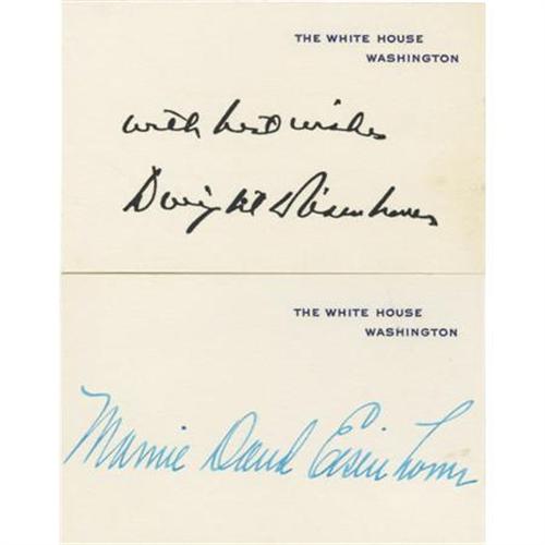 <B>Dwight and Mamie Eisenhower Signatures</B></I> on White House cards, 4 x 2.5, signed <I>Mamie Doud Eisenhower</B></I> and <I>With Best Wishes, Dwight D. Eisenhower</B></I>, in fine condition. <BR><BR><b>Shipping:</b> Flat Material, Small (<a target="_blank" href="http://www.heritageauctions.com/common/shipping.php">view shipping information</a>)