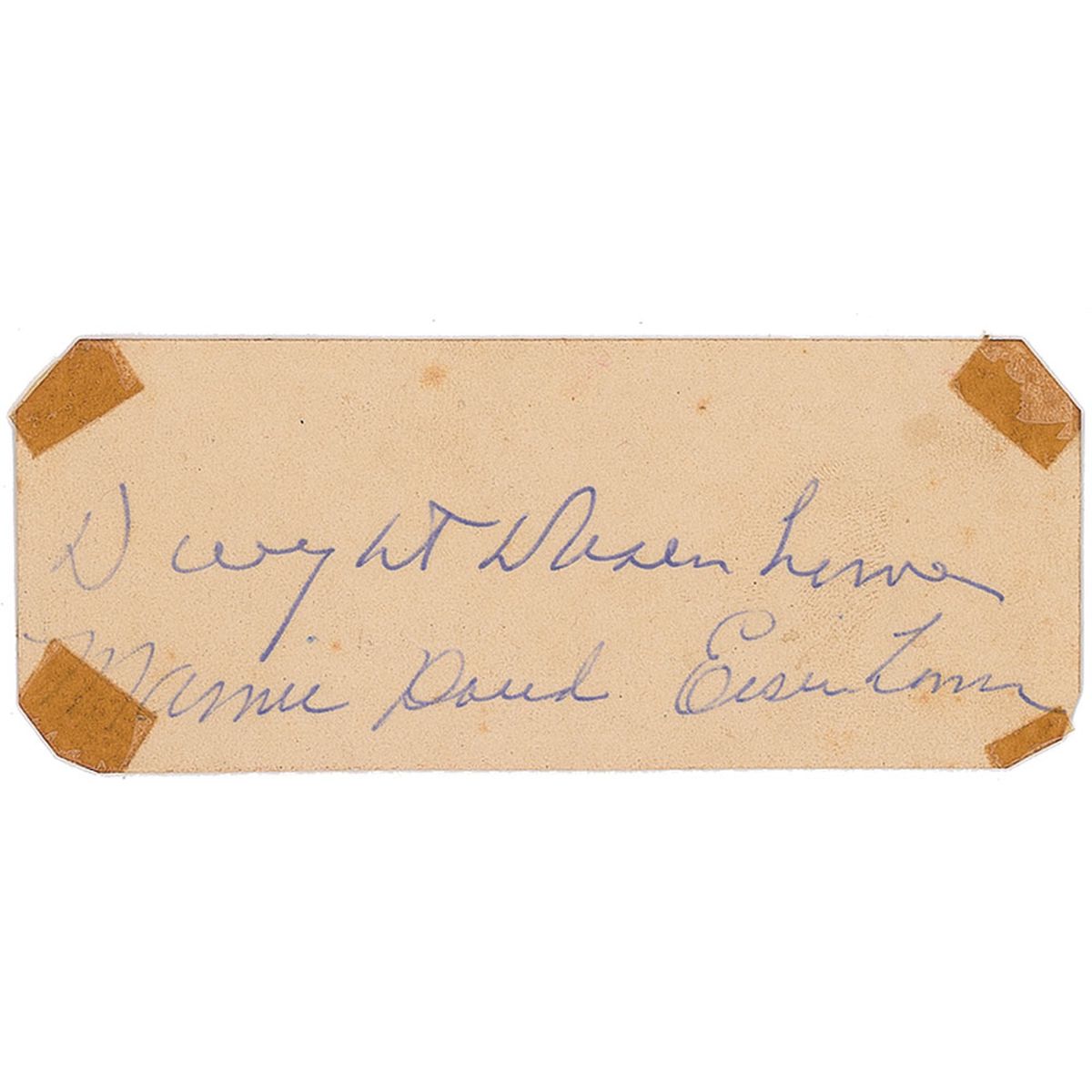 Ballpoint signature, “Dwight D. Eisenhower,” and “Mamie Dowd Eisenhower,” on a 4 x 1.5 trimmed card. In very good condition, with old tape to each corner, one piece covering beginning of Mrs. Eisenhower’s signature, and some scattered light toning and foxing.