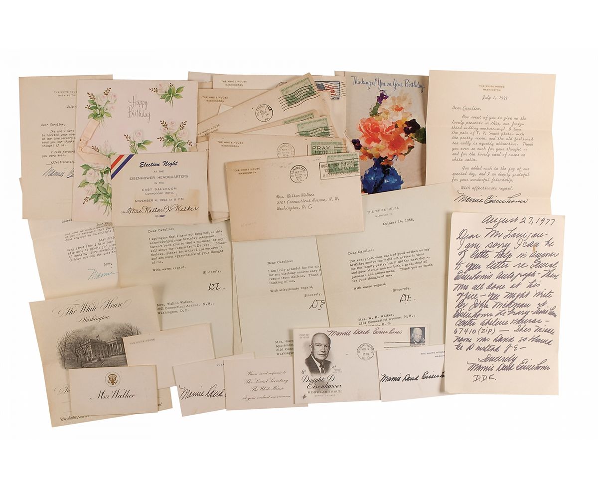 Vast collection of correspondence and other items from Dwight and Mamie Eisenhower to Caroline Walker of Washington D.C. Included in the collection are three TLSs from Dwight Eisenhower, all signed as president, “D. E.,” from 1954, 1958, and 1959 respectively, all one-page on White House letterhead. The letter from 1954 reads, “I apologize that I have not long before this acknowledged your birthday telegram. I haven’t been able to find a moment for myself since my return from Denver. Nonetheless, please know that I did receive it and am most appreciative of your thought of me.” All three are accompanied by their original mailing envelopes. Also included are 26 letters and cards from Mamie Doud Eisenhower, both ALSs and TLSs, as well as several greeting cards, many written from the White House. As well as two FDCs honoring Dwight Eisenhower, both signed by Mamie and two White House cards, each also signed by Mamie. Remainder of the items are letters from secretaries, invitations to the White House or other functions, place cards, RSVPs, and other items, including a telegram to Walker from the White House before a cruise, signed in type “Mamie and Ike.” In very good condition, with moderate toning to Dwight’s letters. An interesting collection from inside the White House.