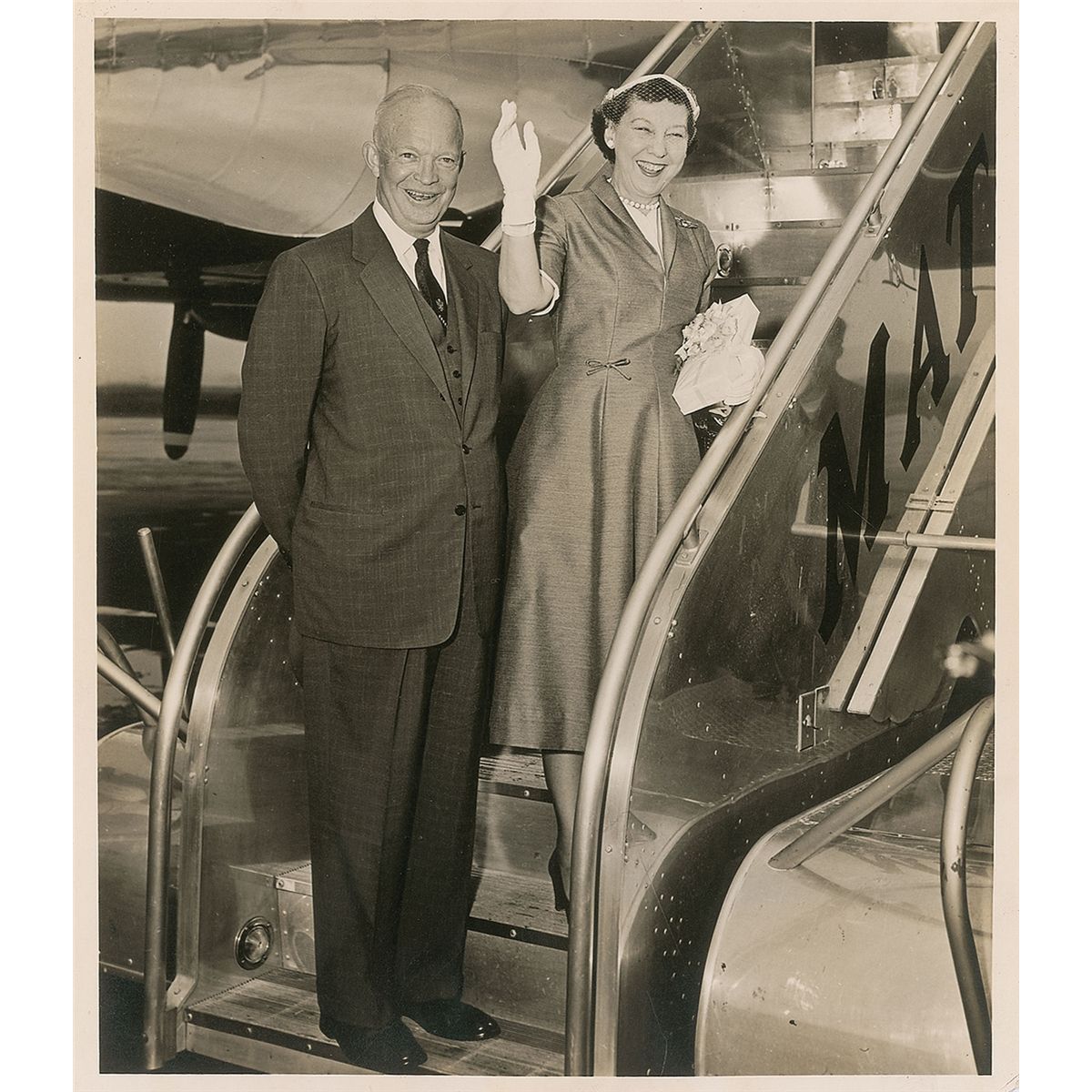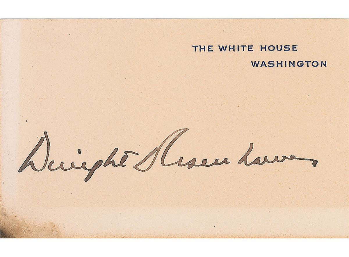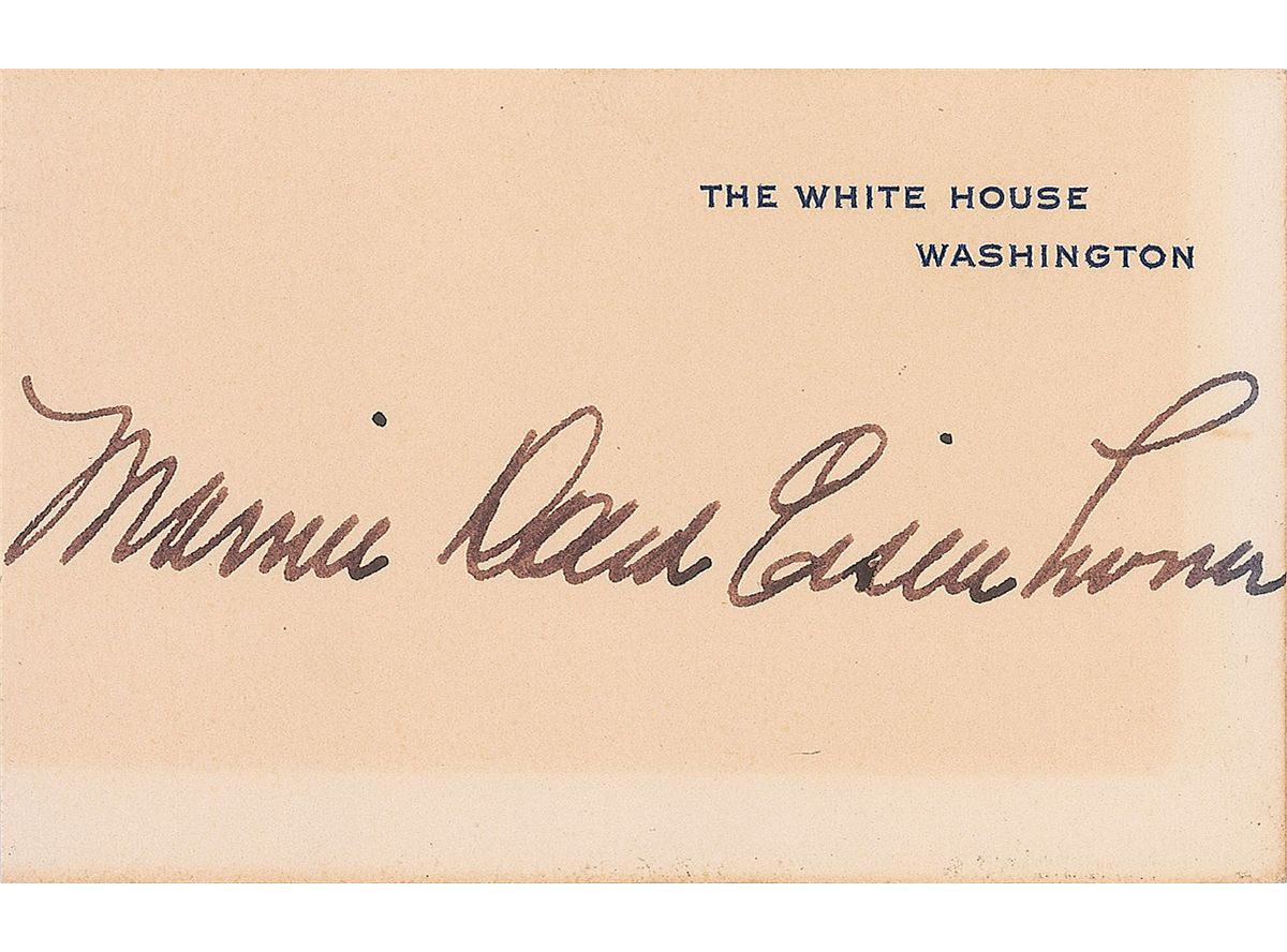 Pair of White House cards, signed individually in fountain pen, “Dwight D. Eisenhower” and “Mamie Doud Eisenhower.” In very good condition, with overall blocks of toning, dark staining to one corner of the Dwight Eisenhower card, and toned tape remnants to reverse of both. Accompanied by an unsigned matte-finish photo of the couple.