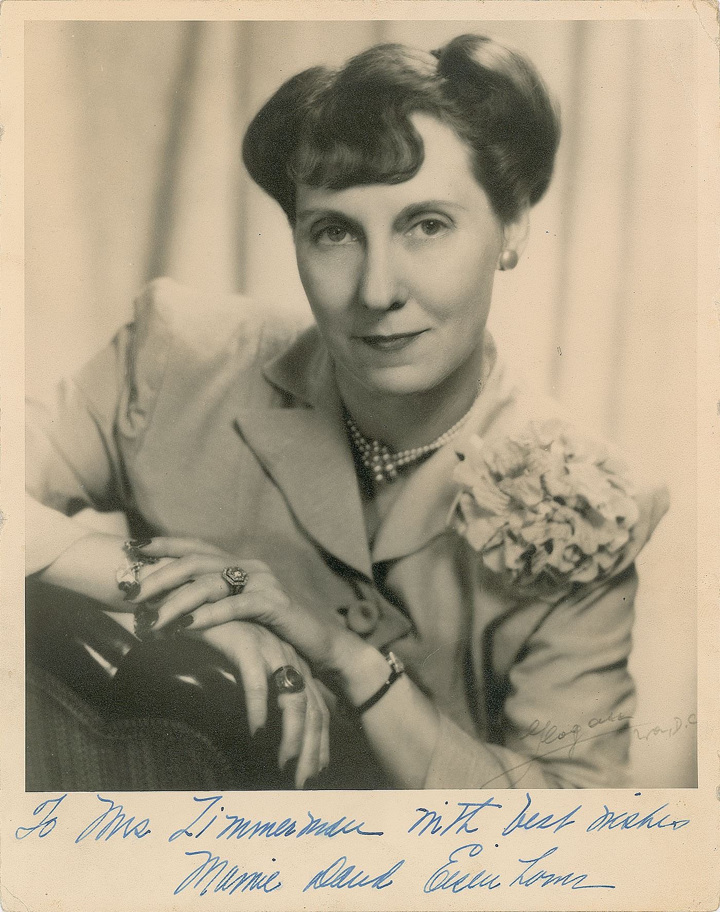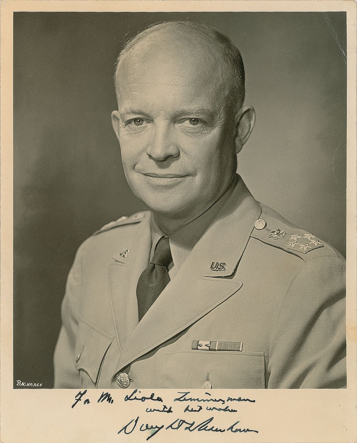 Two matte-finish 8 x 10 photos: a Bachrach portrait of Ike in his five-star military uniform, signed and inscribed in the lower border in fountain pen, "For Mrs. Liola Zimmerman with best wishes, Dwight D. Eisenhower"; and a seated portrait of Mamie with a lovely flower brooch to left shoulder, signed and inscribed in the lower border in fountain pen, "To Mrs. Zimmerman with best wishes, Mamie Doud Eisenhower." In overall fine condition, with creases to the upper right corner of each photo.