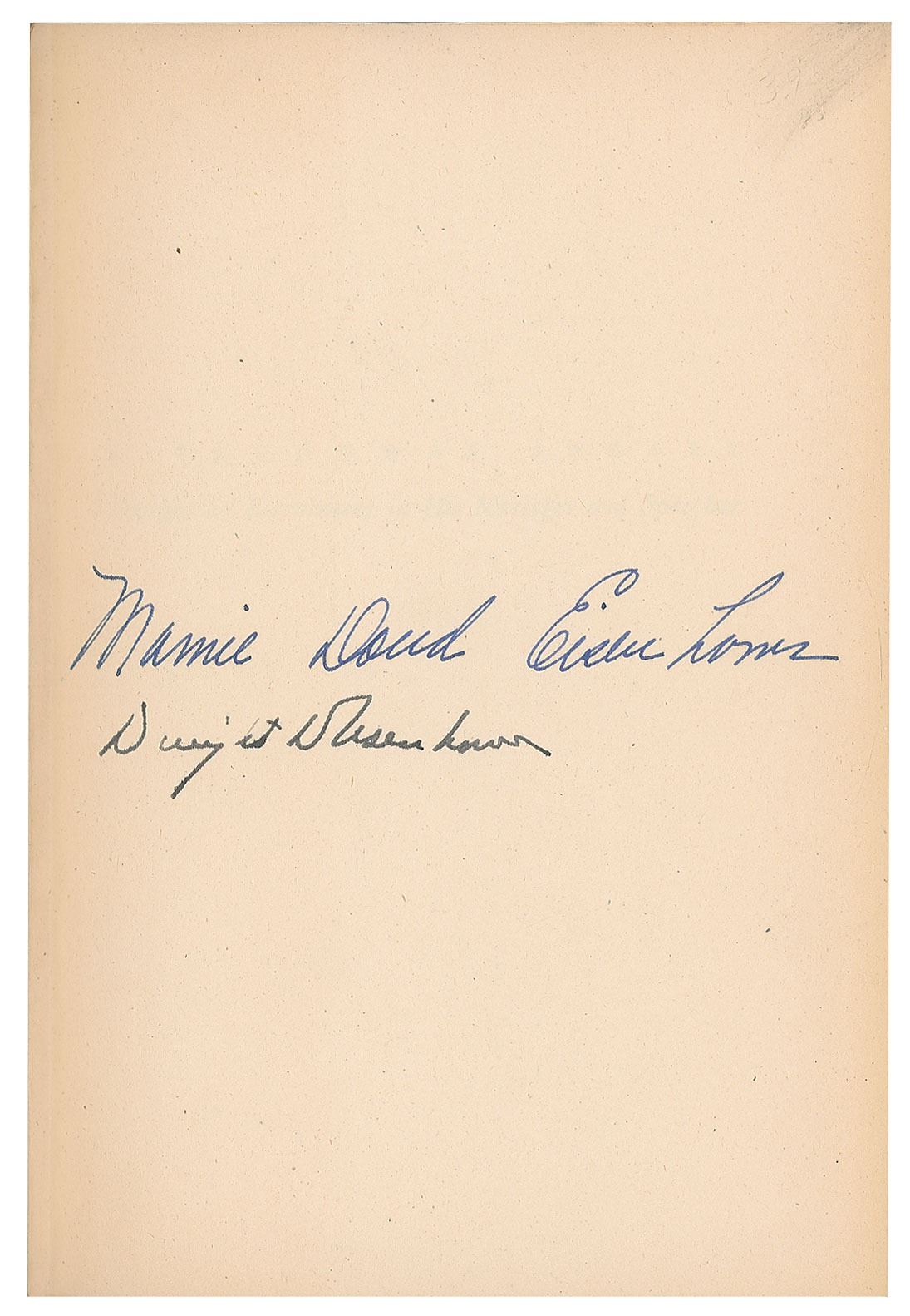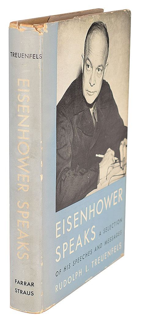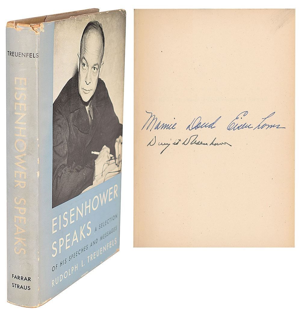 Signed book: Eisenhower Speaks. First edition. NY: Farrar, Straus & Company, 1948. Hardcover with dust jacket, 5.75 x 8.25, 299 pages. Signed on the first free end page in fountain pen, "Dwight D. Eisenhower" and "Mamie Doud Eisenhower." Autographic condition: fine. Book condition: VG/VG, with edge nicks and soiling to dust jacket, and a "Library of Lawrence E. Miller" blindstamp to a rear page.