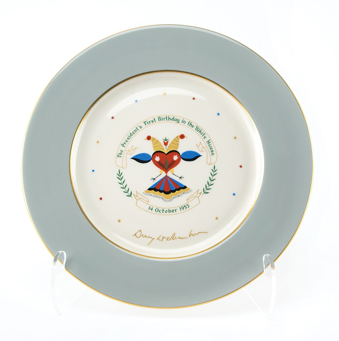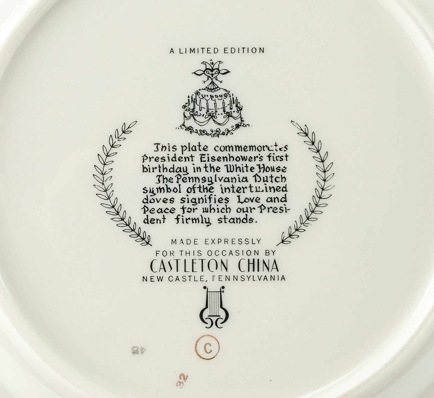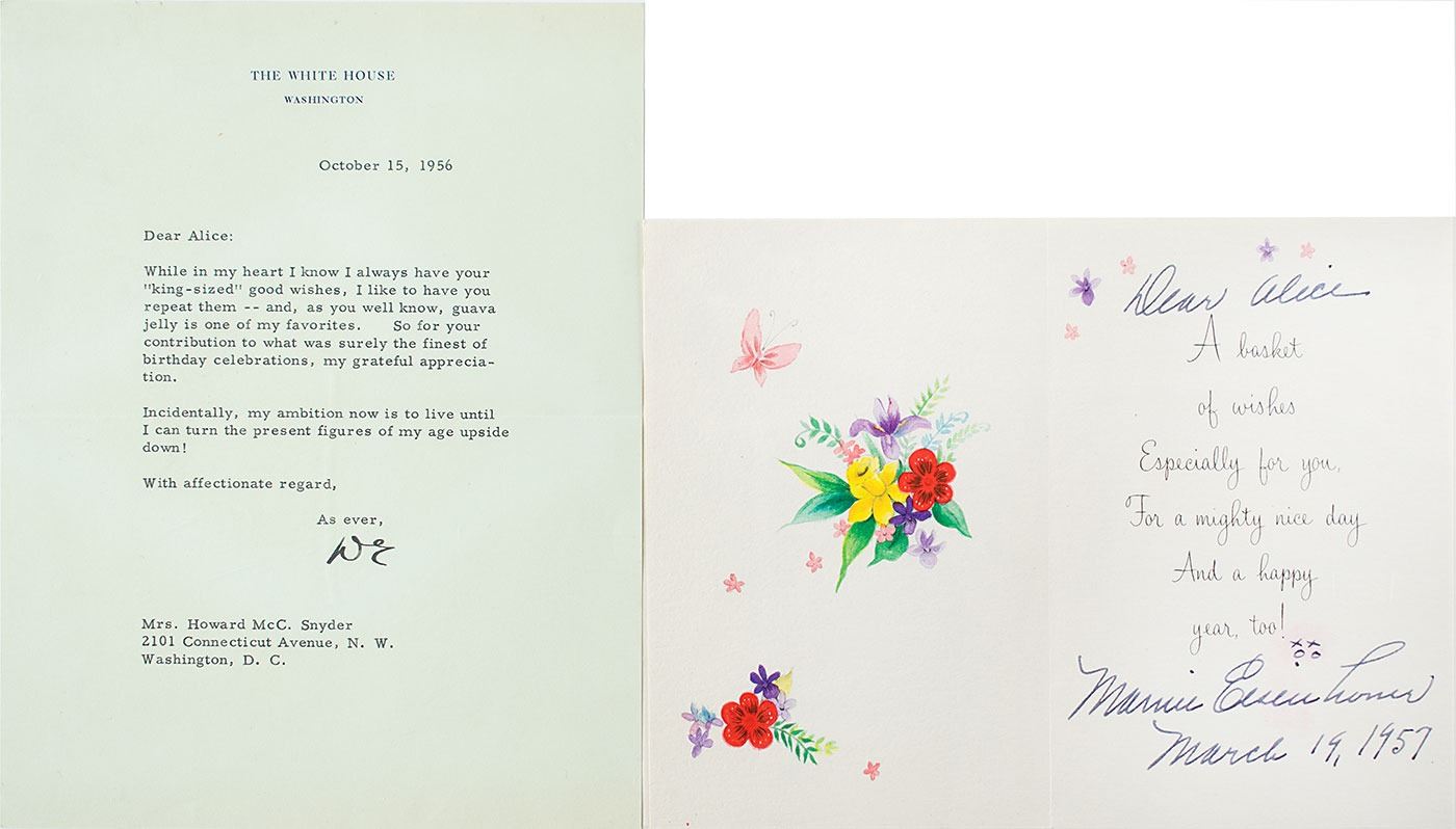Three items: a TLS as president signed "D.E.," one page, White House letterhead, October 15, 1956, to Mrs. Howard McCrum Snyder, in part: "While in my heart I know I always have your 'king-sized' good wishes, I like to have you repeat them—and, as you well know, guava jelly is one of my favorites. So for your contribution to what was surely the finest of birthday celebrations, my grateful appreciation"; a birthday card sent by Mamie to Mrs. Howard McCrum Snyder, signed and inscribed inside as first lady, "Dear Alice, xoxo, Mamie Eisenhower, March 19, 1957"; and a limited edition birthday plate created by Castleton China for Dwight D. Eisenhower's first birthday in the White House on October 14, 1953, as produced for sale to the general public in limited numbers, with a square-shaped backstamp. In fine condition. Accompanied by the original mailing envelopes for the letters, and the original box for the plate.