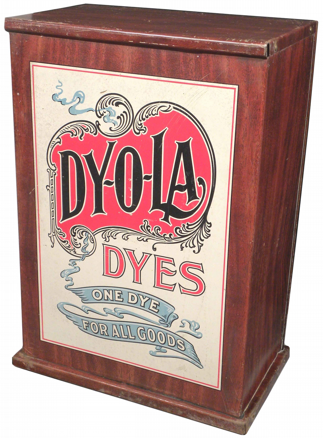 Dy-O-La Dyes Store Display Cabinet. Tin litho front and interior door. Interior pigeon holes with color identification. 2 Dy-o-la instruction booklets and 2 informational pamphlets. Door knob missing, slight discoloration on front panel otherwise very good condition. 11 1/2 X 16 X 7 inches.