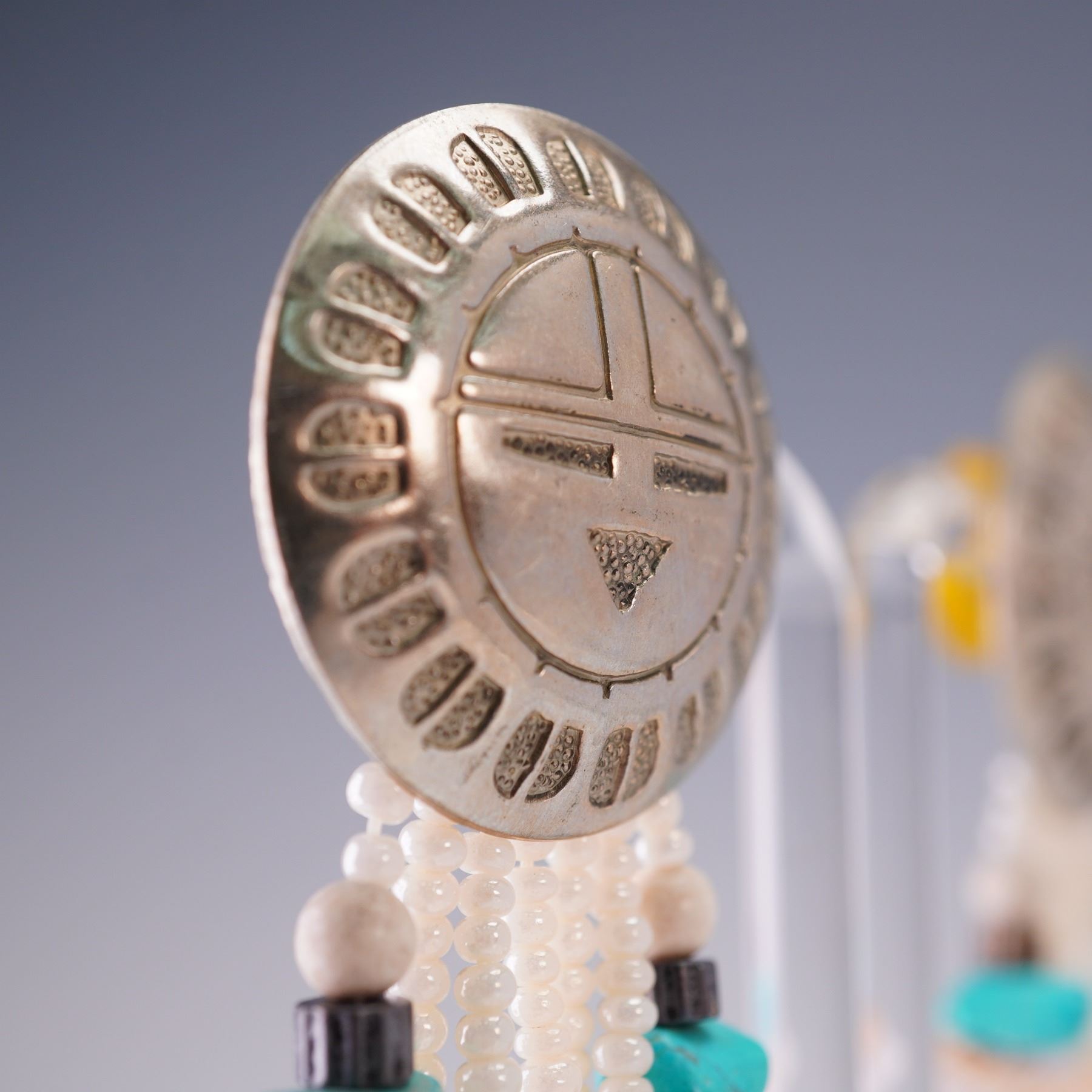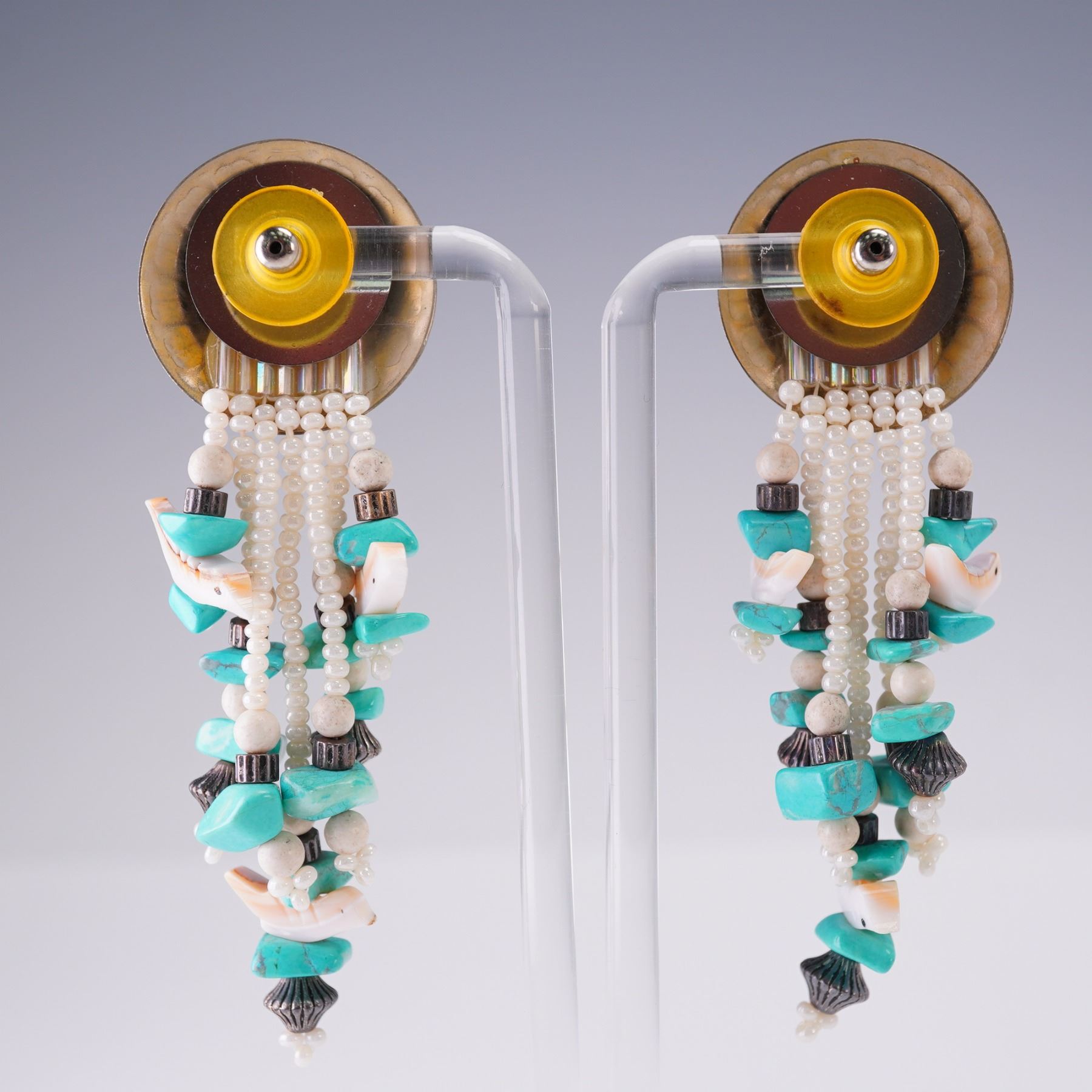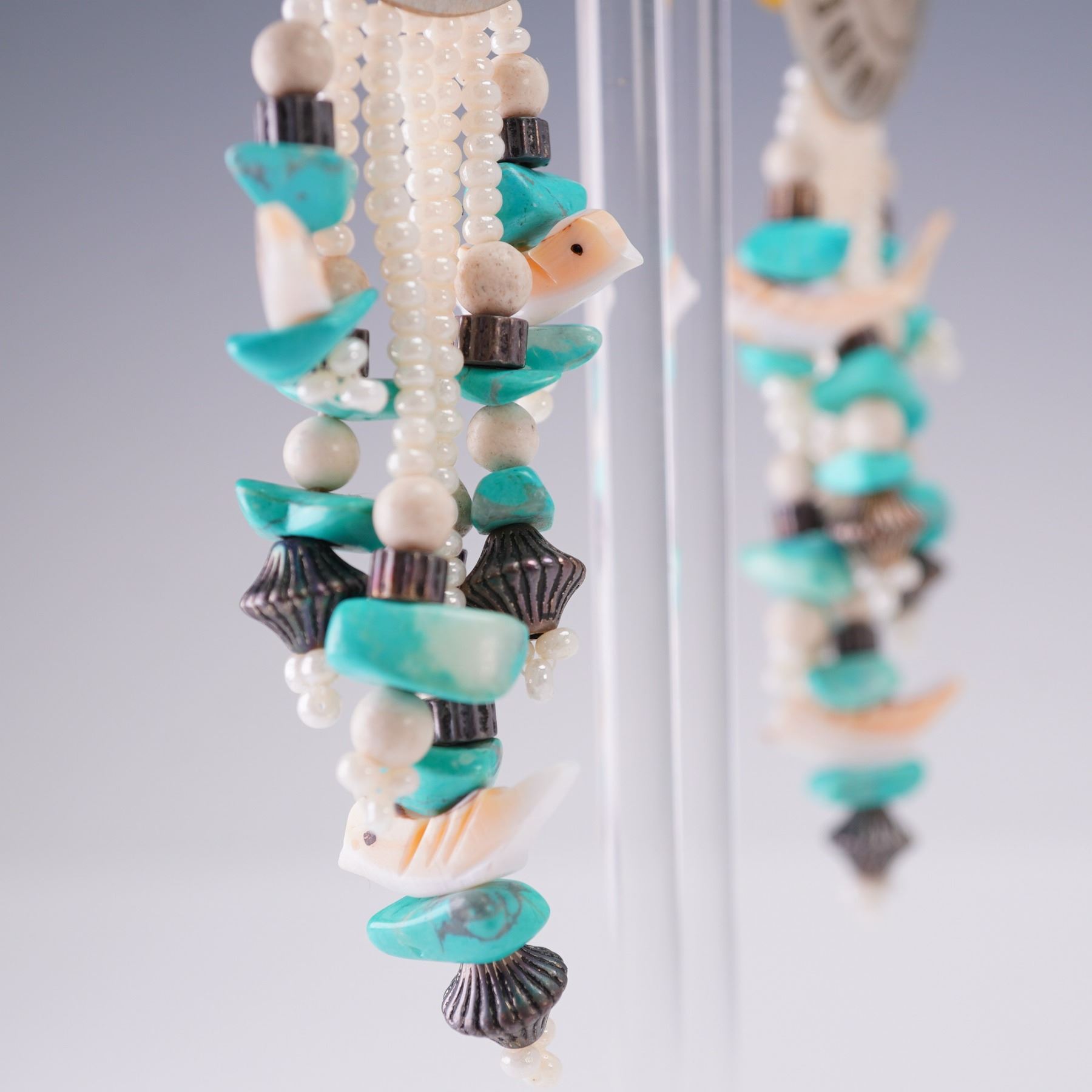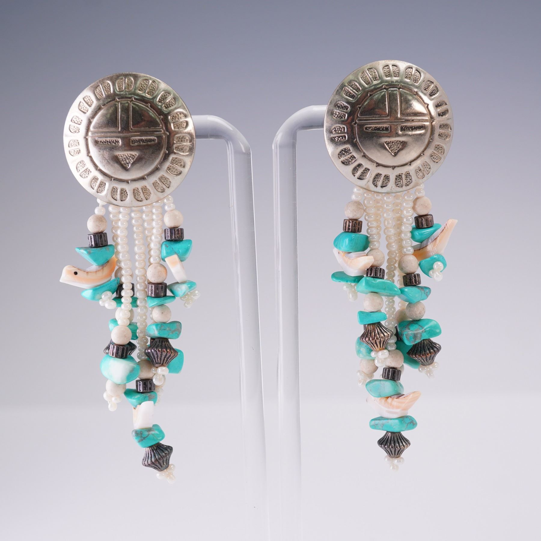 Pair of Dyanne Silver Artrageous Accessories post-back earrings from Santa Fe. Features silver tone etched medallion tops with cascading strands of faux pearls, turquoise-tone chips, heishi-style beads, and carved bird accents. Measures approximately 3.25"H.
