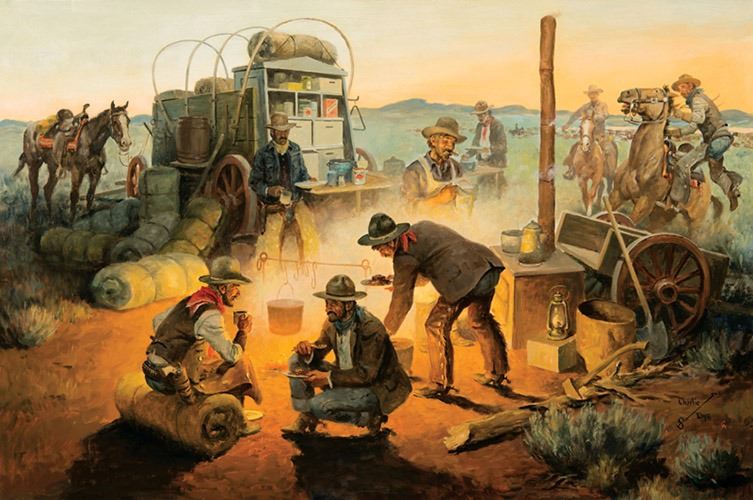 Charlie Dye was a working cowboy on a roundup with Joe Beeler and John Hampton in 1964 when they came up with the idea of the Cowboy Artists of America. Of his own art, Dye said, “I have always tried to paint what I can remember of a life a led before I became dishonest and studied art. My old man could have forgiven me if I had turned out playing piano in a whorehouse, but artists rated one step below pimps in his book.” Dye’s details of cowboy life, like the smoke from the joints of the stovepipe in Beef and Beans, as an example, unite the eye of the artist with the experience of the range.