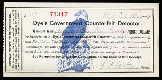 Philadelphia, PA, 1889, Receipt for 1 year of the counterfeit banknote and coin detector journal, Black text on dark blue underprint of eagle sitting on sign for the name of the company and address, back has light blue cherubs flanking U.S. Mint test chemical formulas for testing for gold and silver coins, side of the back states United States Mint - FLUID TESTS for Gold and Silver Coins. AU condition. Attractive and interesting banknote related ephemera.