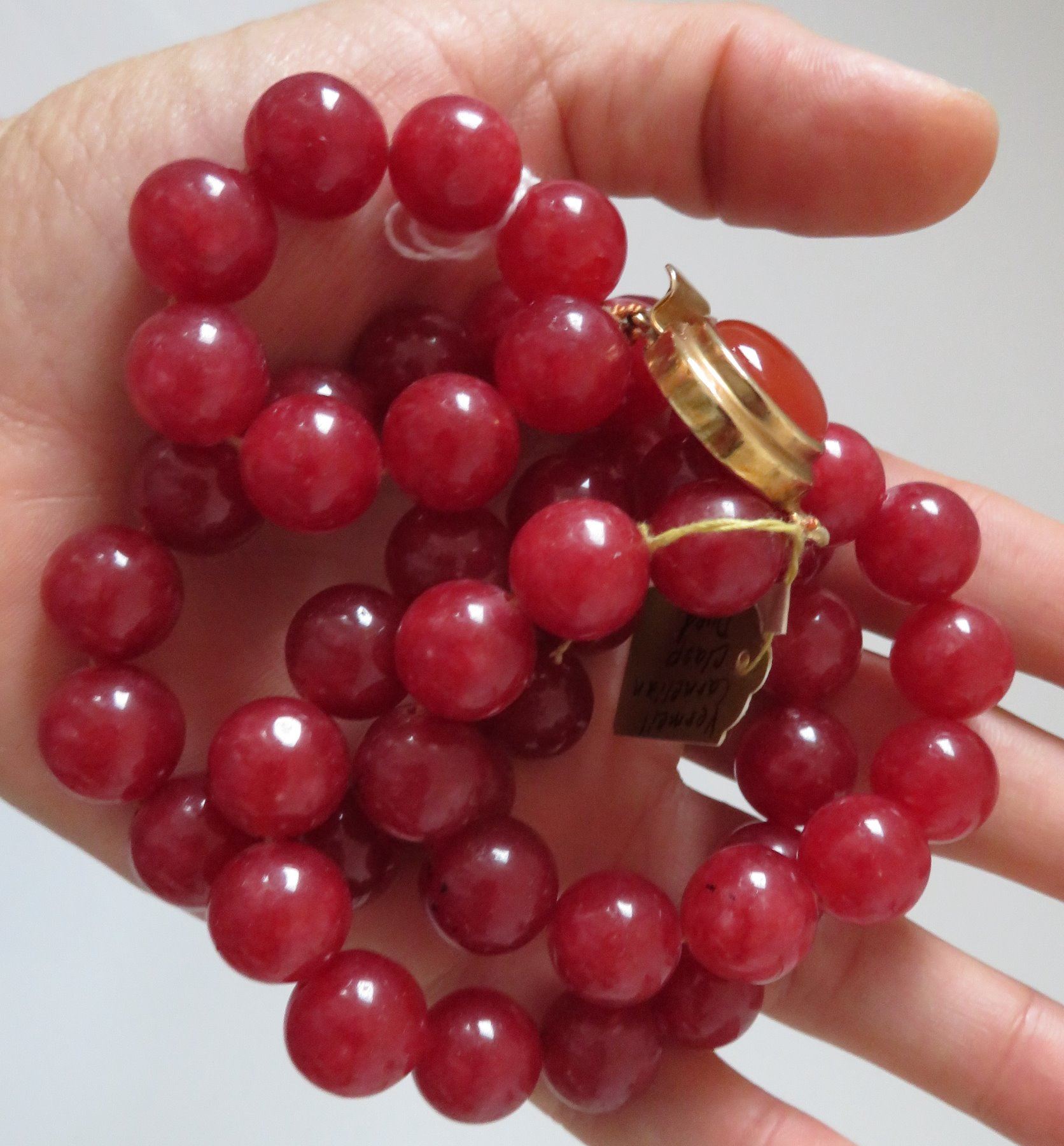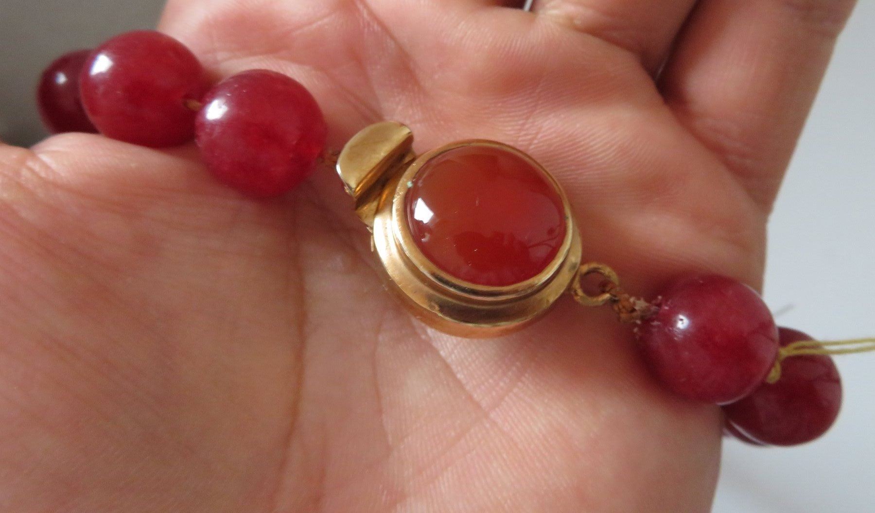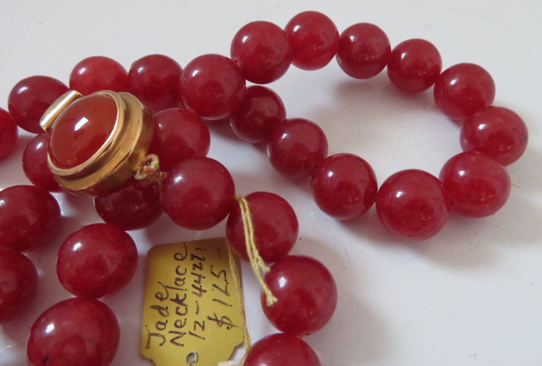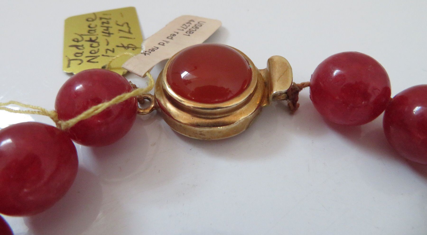 Dyed Jade Necklace w/Vermeil Carnelian Clasp, 20th century item. Made of dyed jade and carnelian, the item hangs 14" as worn. Condition: Good, see images. Shipping: $15.50 w/insurance and signature.